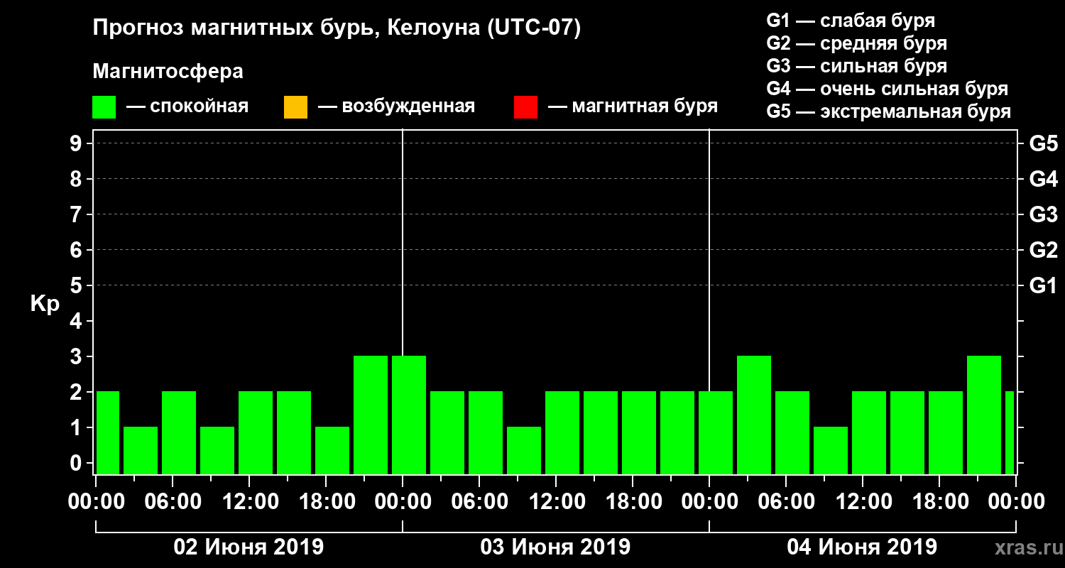 Прогноз магнитных бурь в Келоуне на 2 июня 2019 года