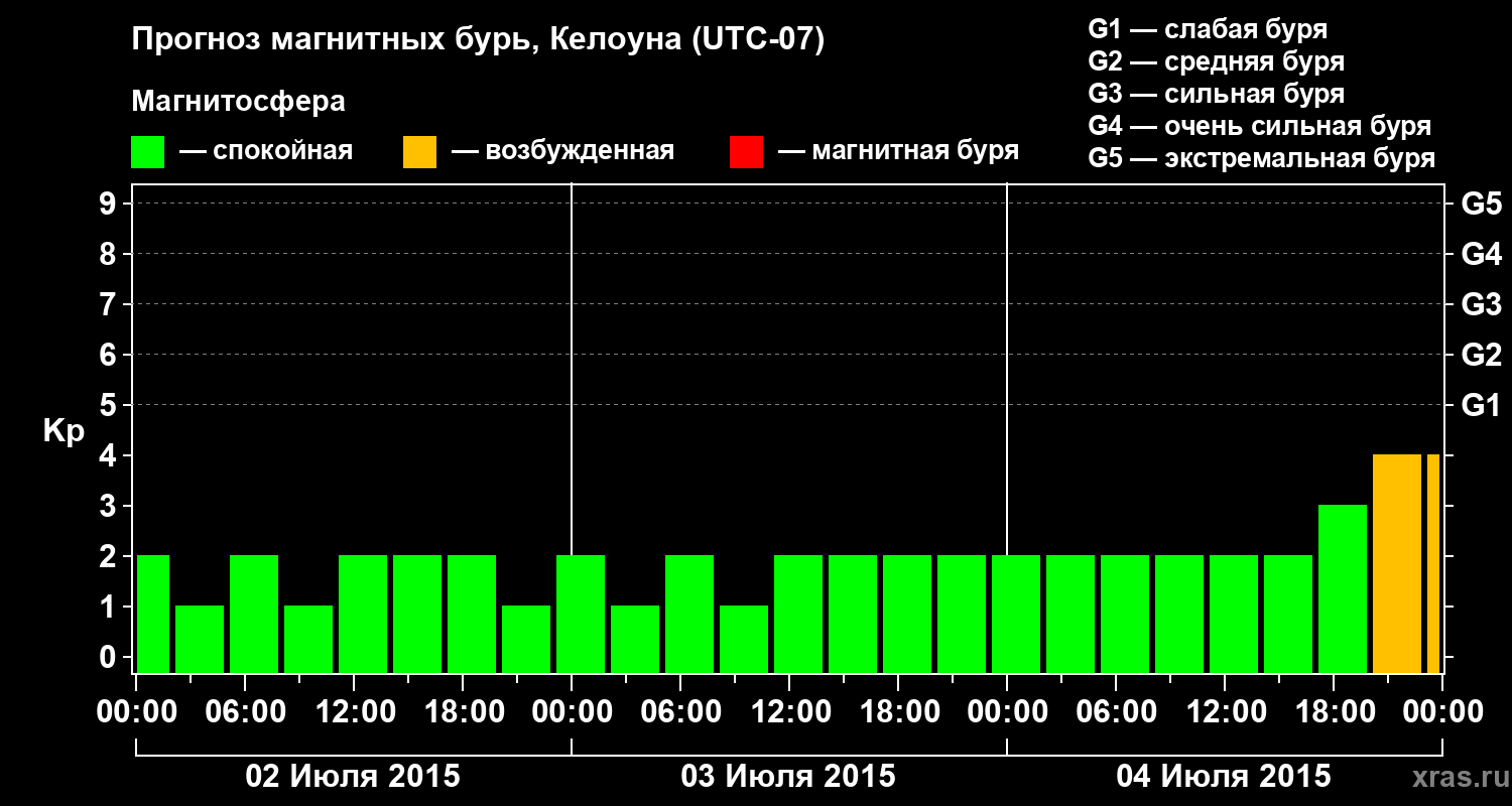 Прогноз магнитных бурь в Келоуне на 2 июля 2015 года