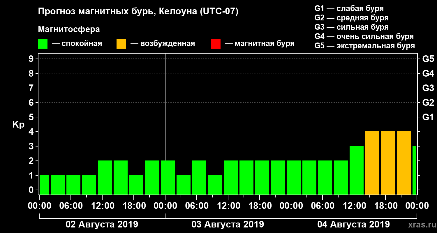 Прогноз магнитных бурь в Келоуне на 2 августа 2019 года