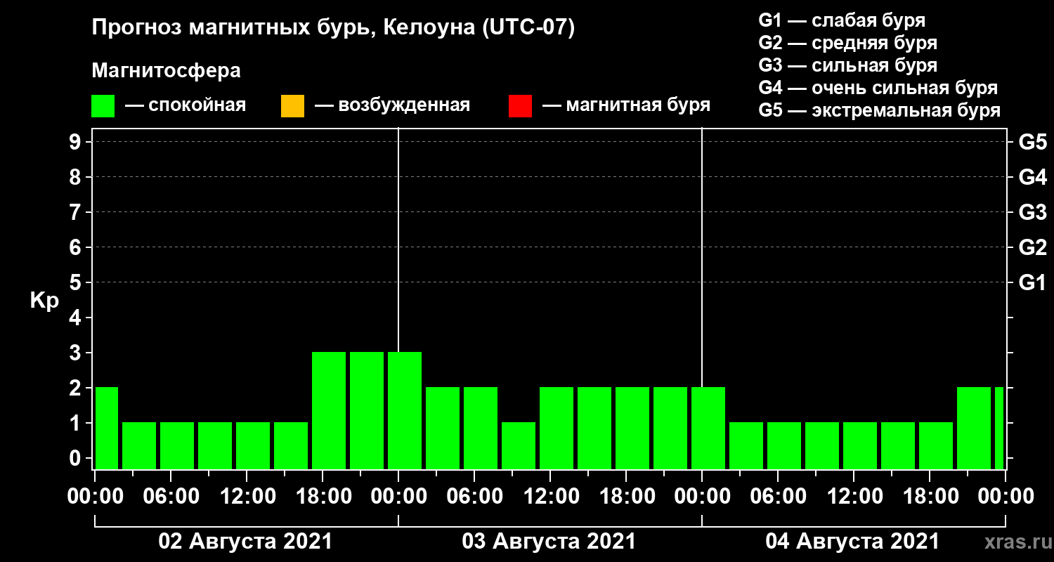 Прогноз магнитных бурь в Келоуне на 2 августа 2021 года