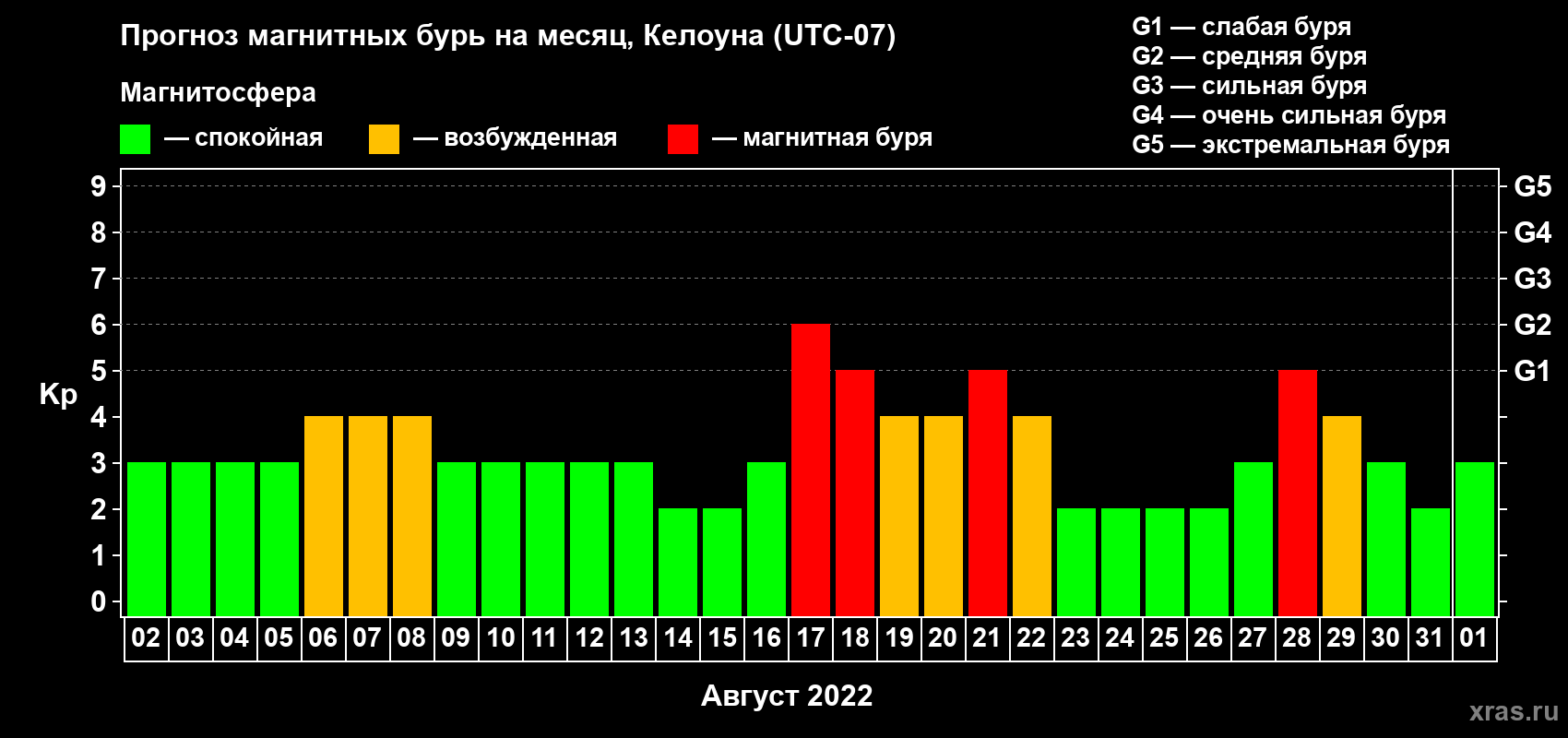 Прогноз магнитных бурь в Келоуне на 2 августа 2022 года