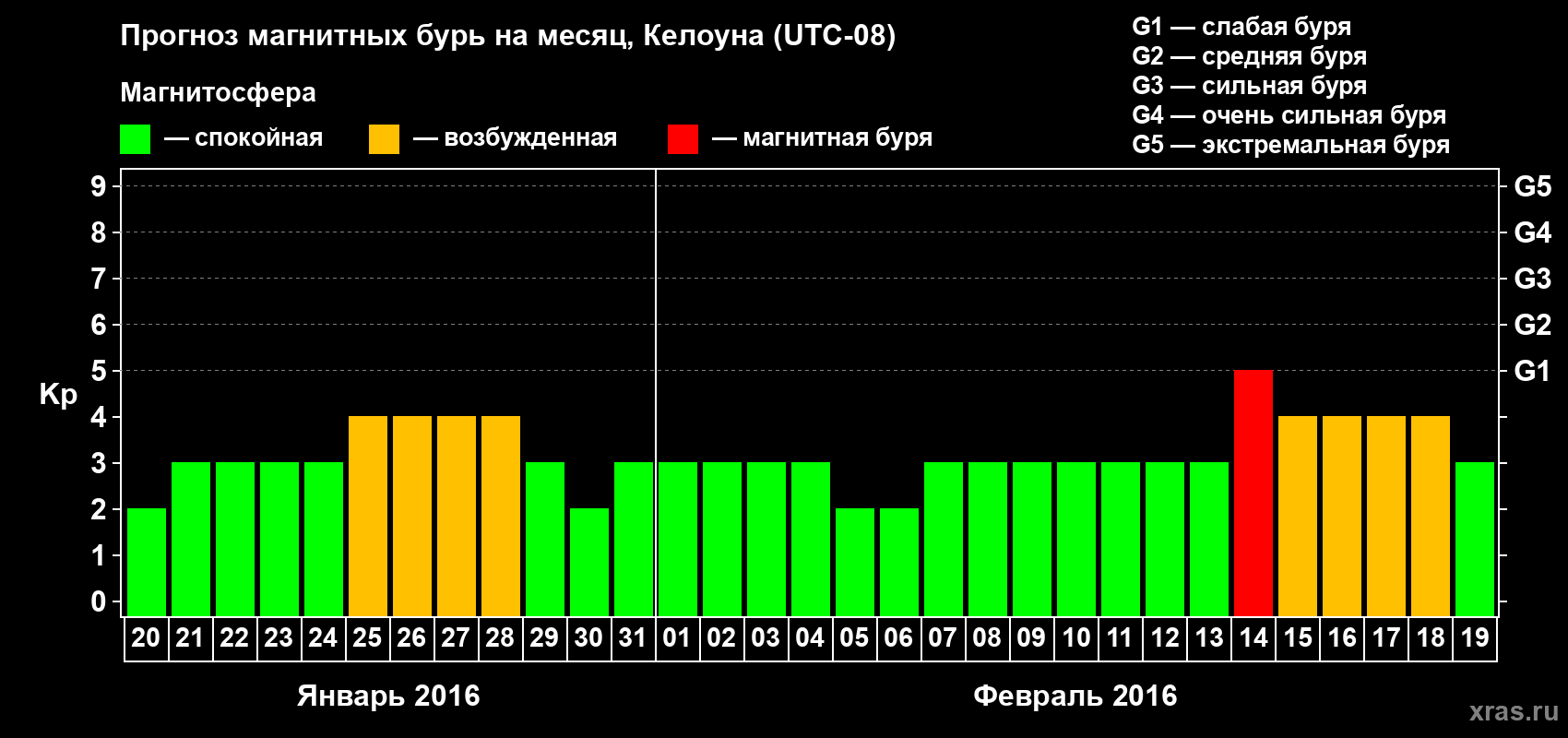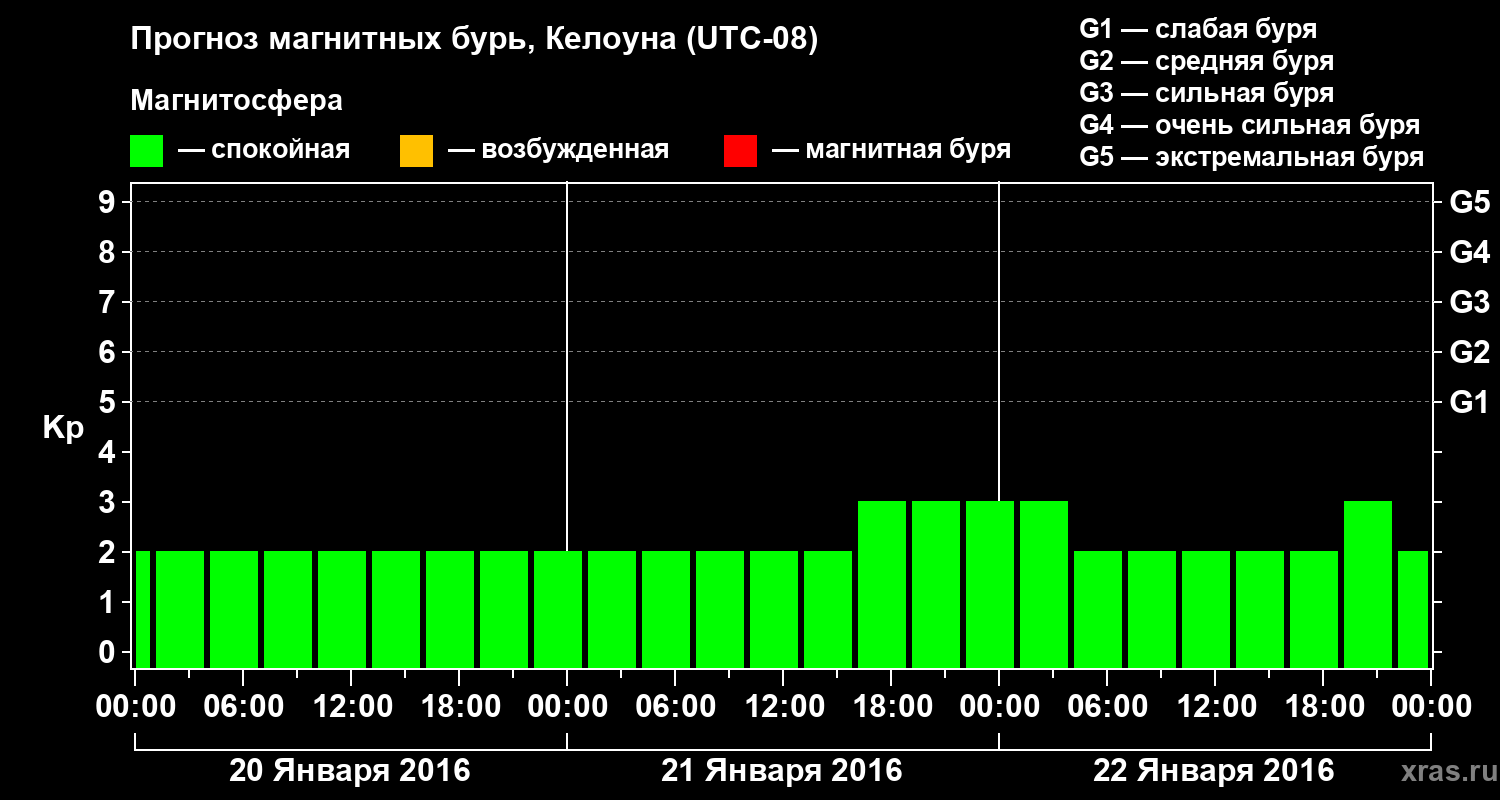 Прогноз магнитных бурь в Келоуне на 20 января 2016 года