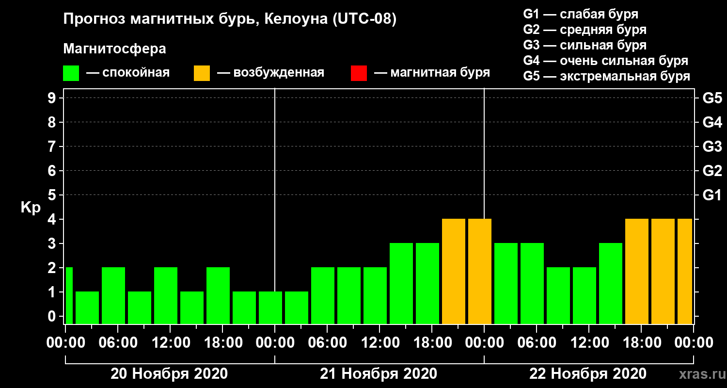 Прогноз магнитных бурь в Келоуне на 20 ноября 2020 года