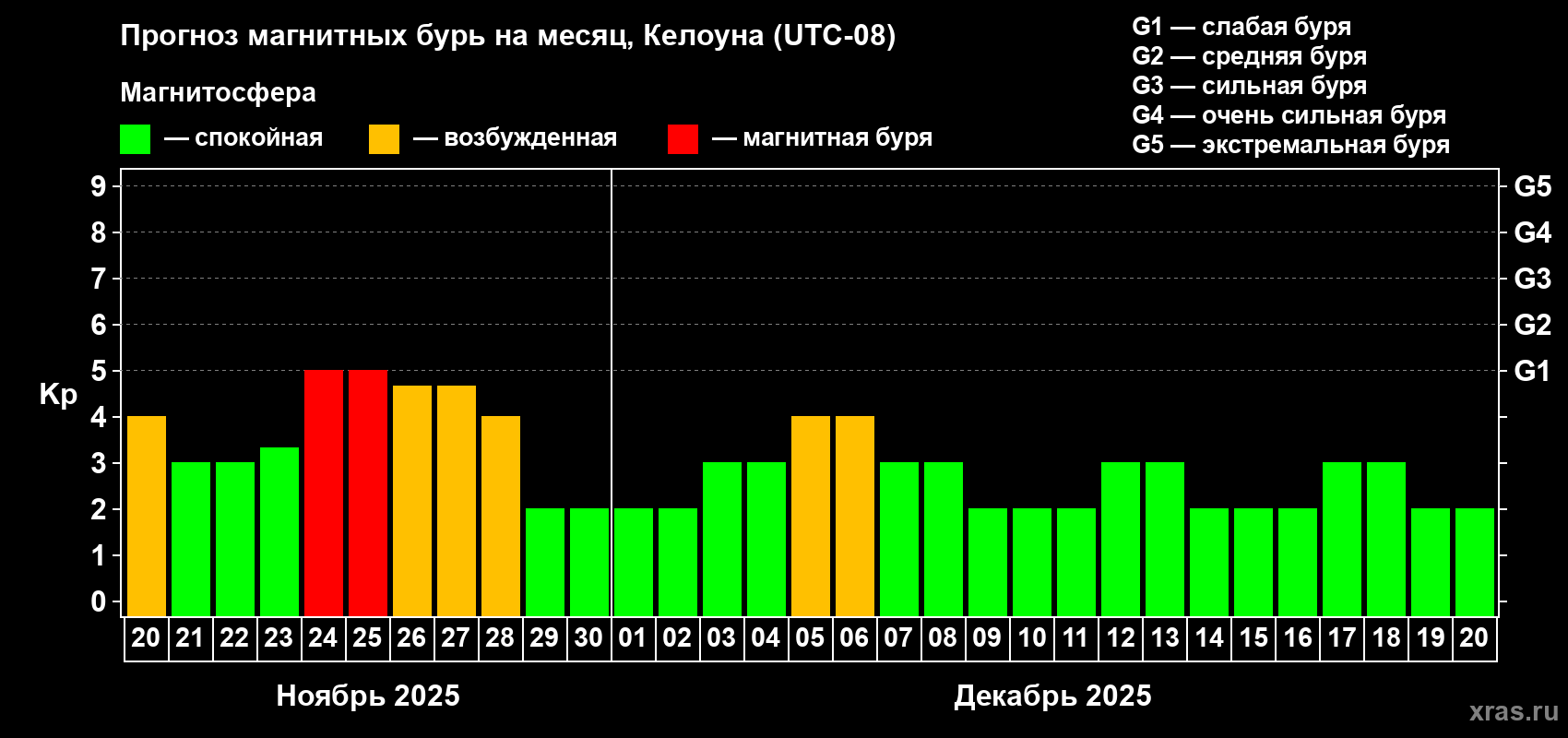 Прогноз магнитных бурь в Келоуне — 20 ноября 2025 года