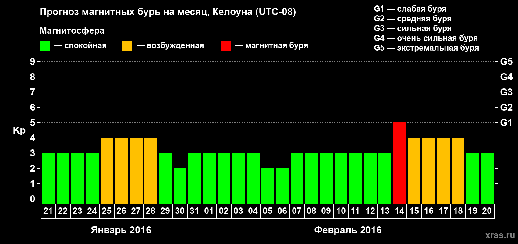 Прогноз магнитных бурь в Келоуне на 21 января 2016 года