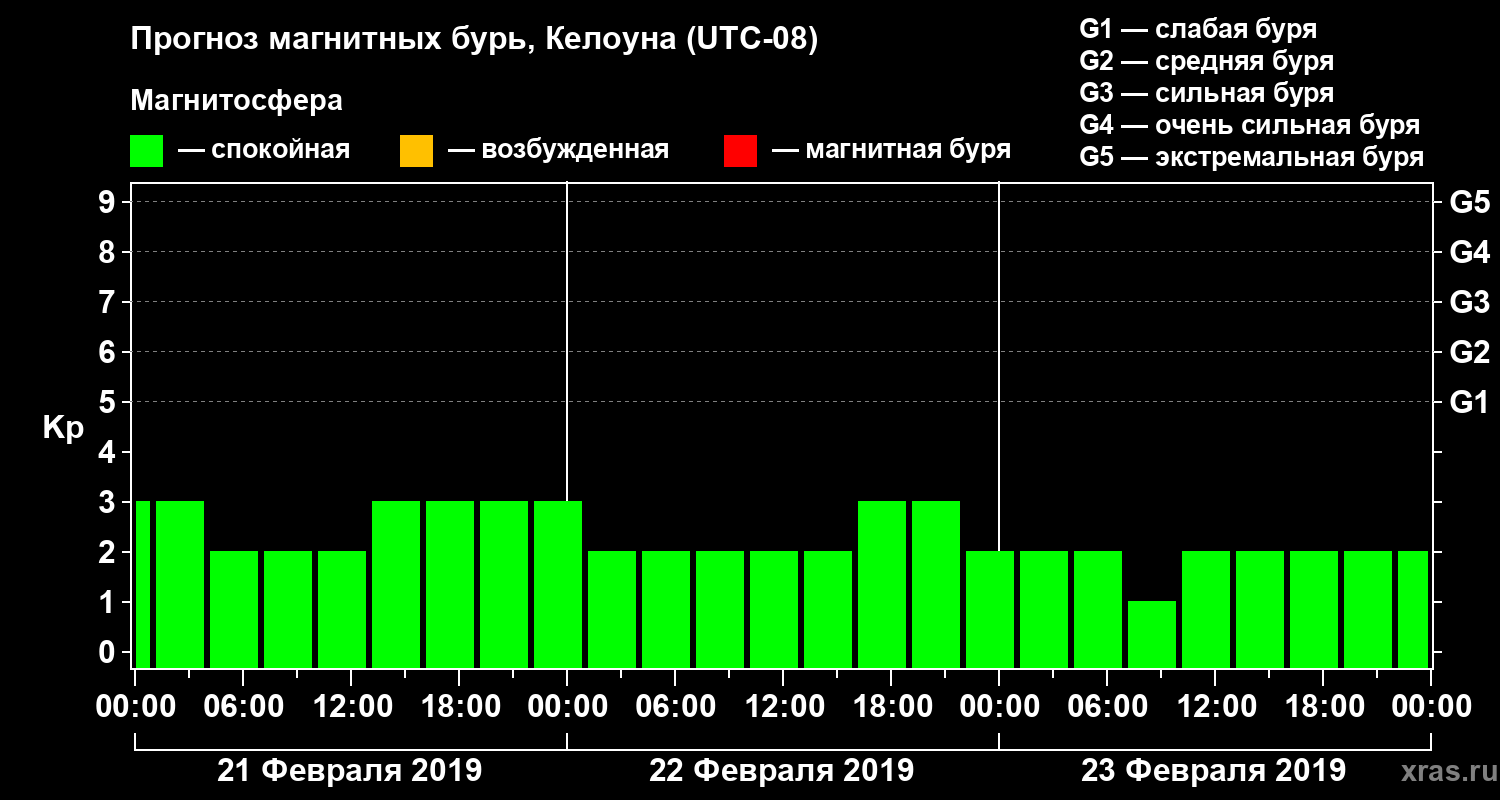 Прогноз магнитных бурь в Келоуне на 21 февраля 2019 года