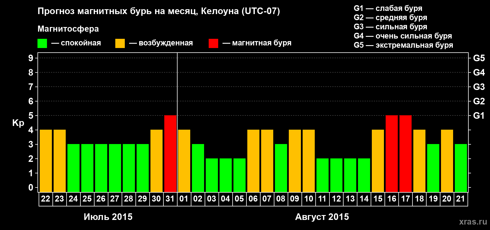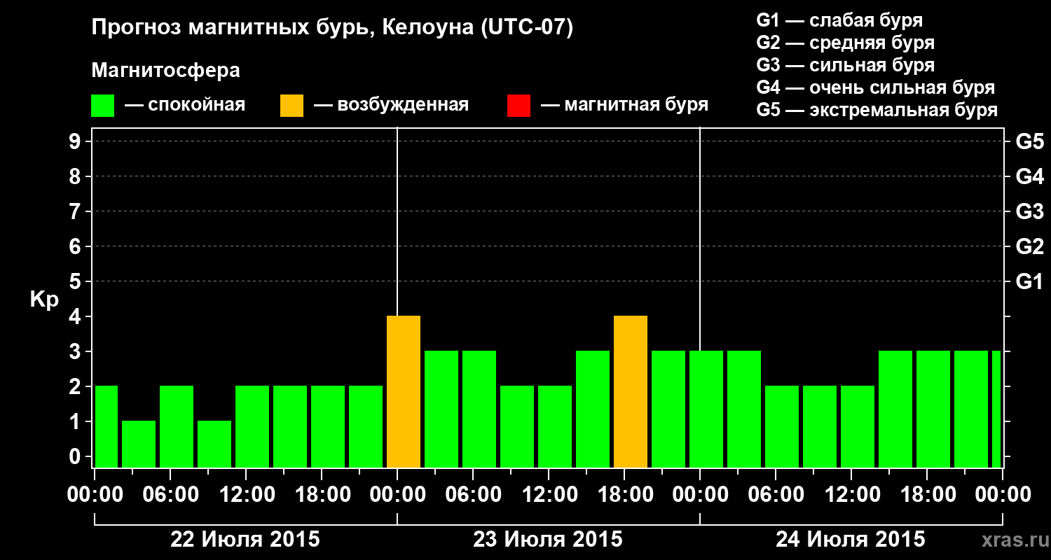 Прогноз магнитных бурь в Келоуне на 22 июля 2015 года