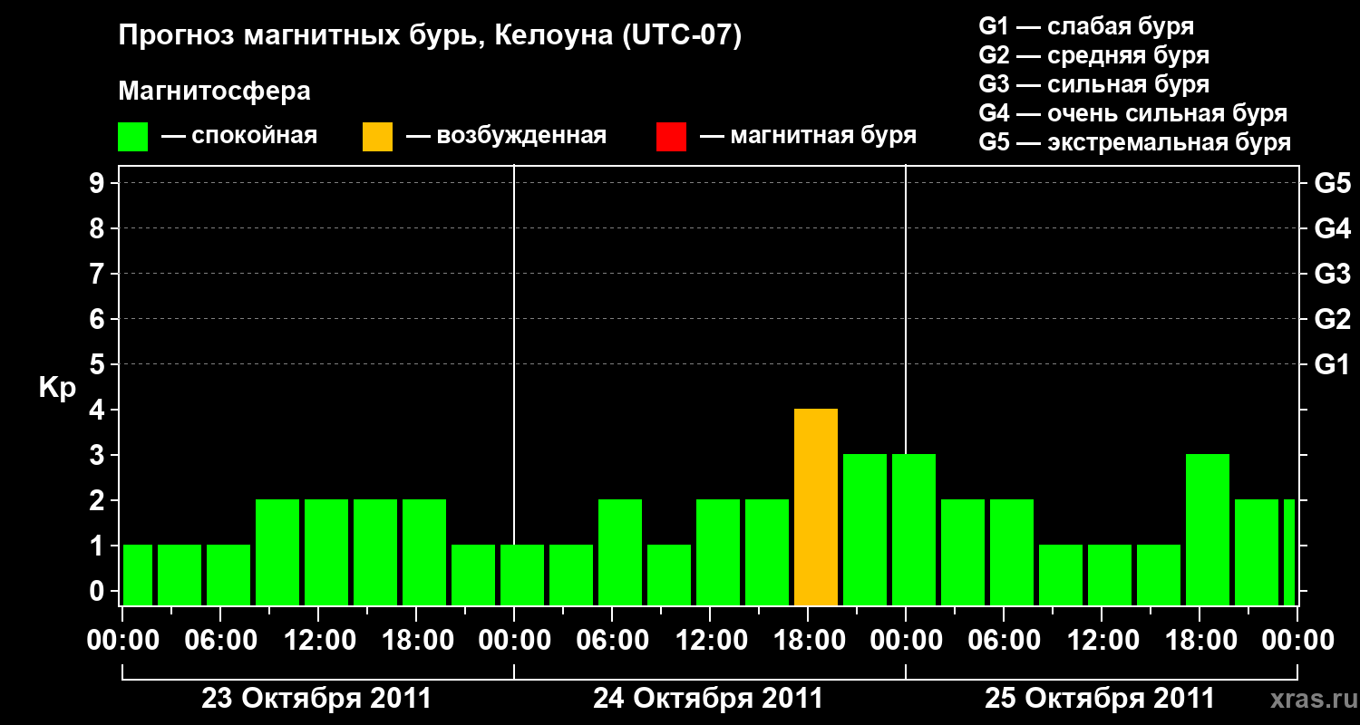 Прогноз магнитных бурь в Келоуне на 23 октября 2011 года