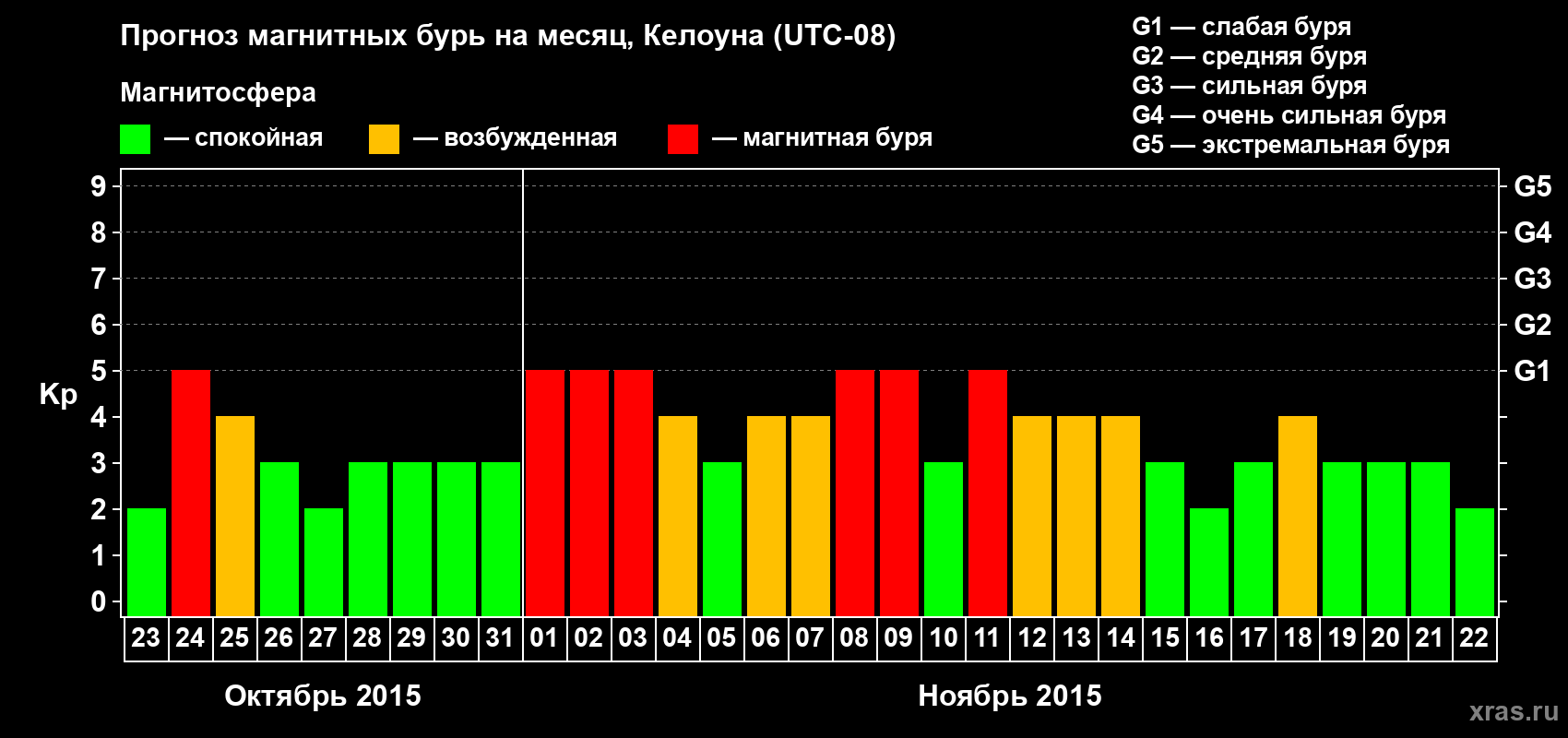 Прогноз магнитных бурь в Келоуне на 23 октября 2015 года