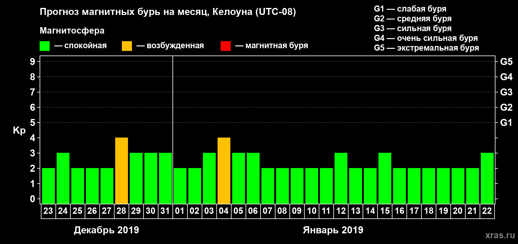Прогноз магнитных бурь в Келоуне на 23 декабря 2018 года