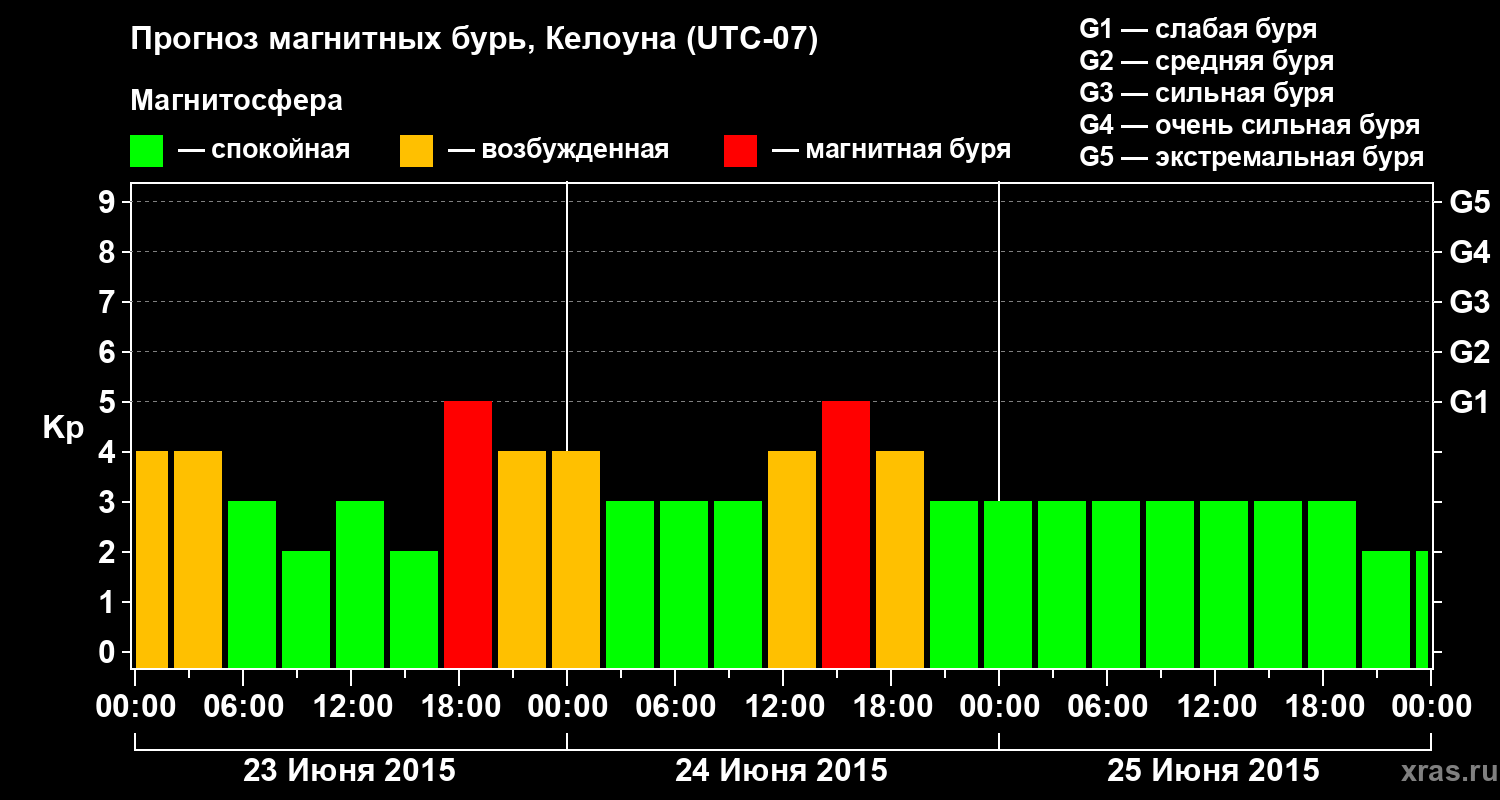 Прогноз магнитных бурь в Келоуне на 23 июня 2015 года