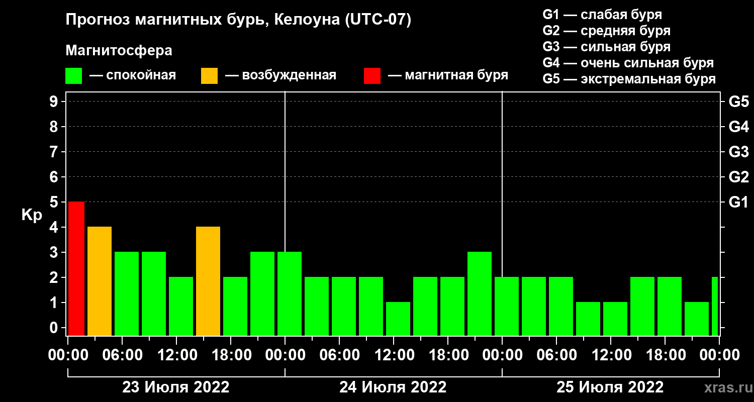 Прогноз магнитных бурь в Келоуне на 23 июля 2022 года