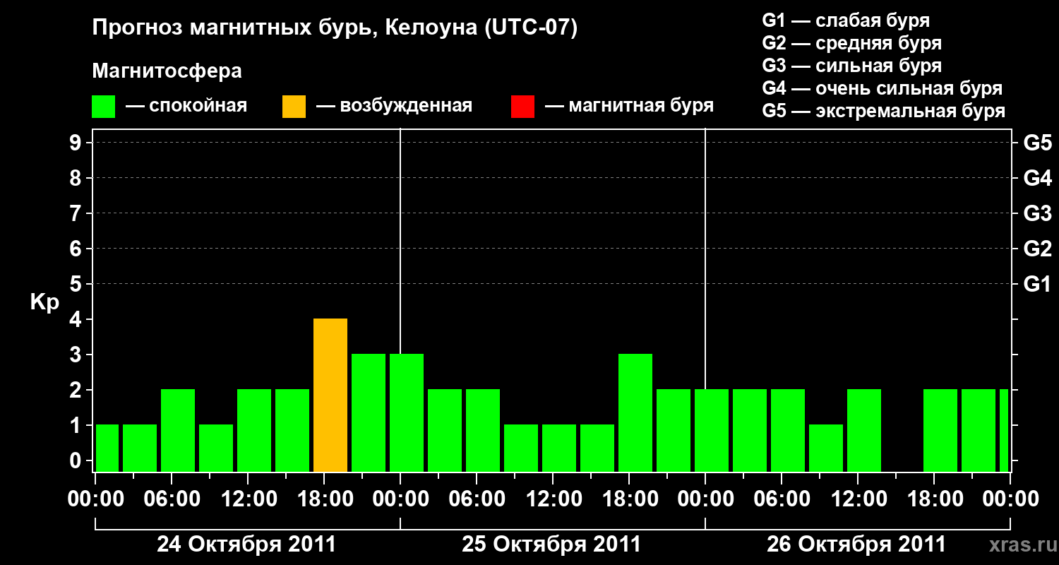 Прогноз магнитных бурь в Келоуне на 24 октября 2011 года