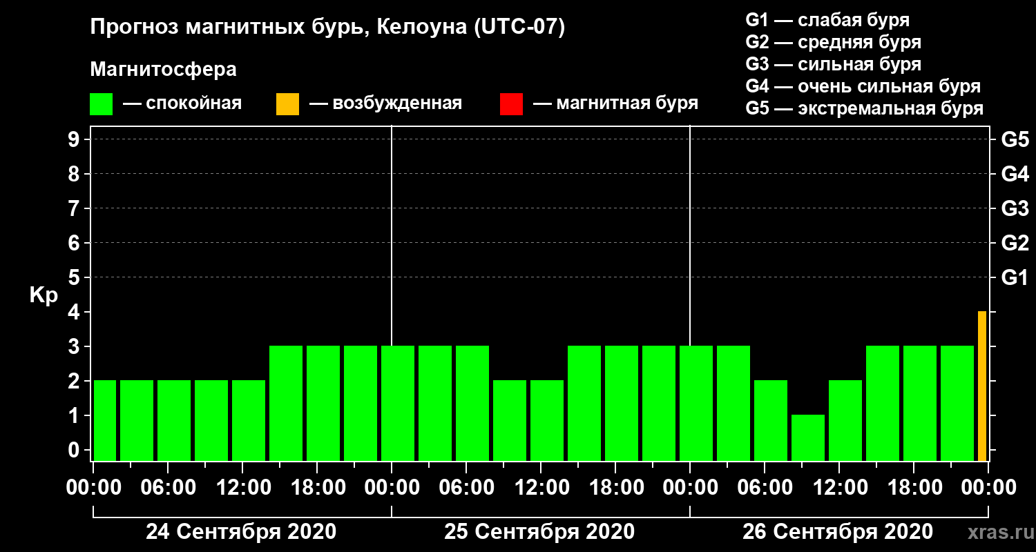 Прогноз магнитных бурь в Келоуне на 24 сентября 2020 года