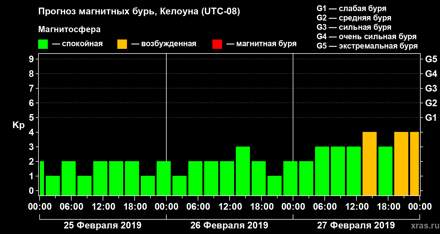 Прогноз магнитных бурь в Келоуне на 25 февраля 2019 года
