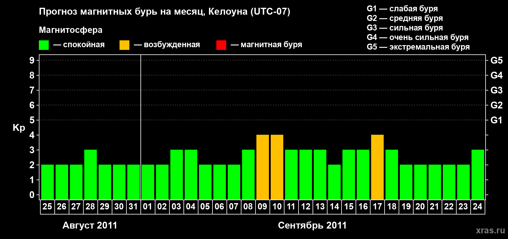 Прогноз магнитных бурь в Келоуне на 25 августа 2011 года