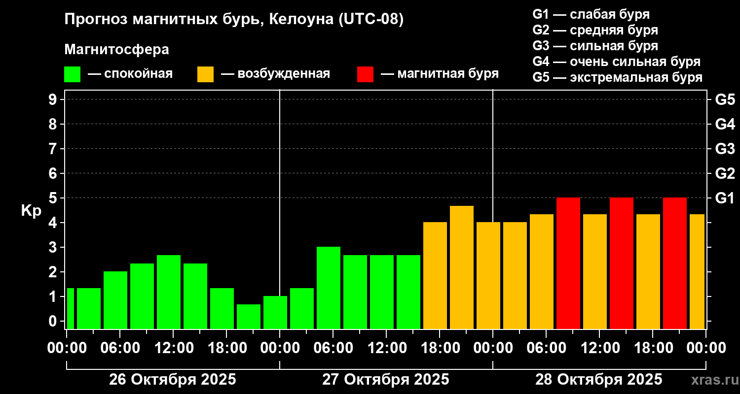 Прогноз магнитных бурь в Келоуне на 26 октября 2025 года