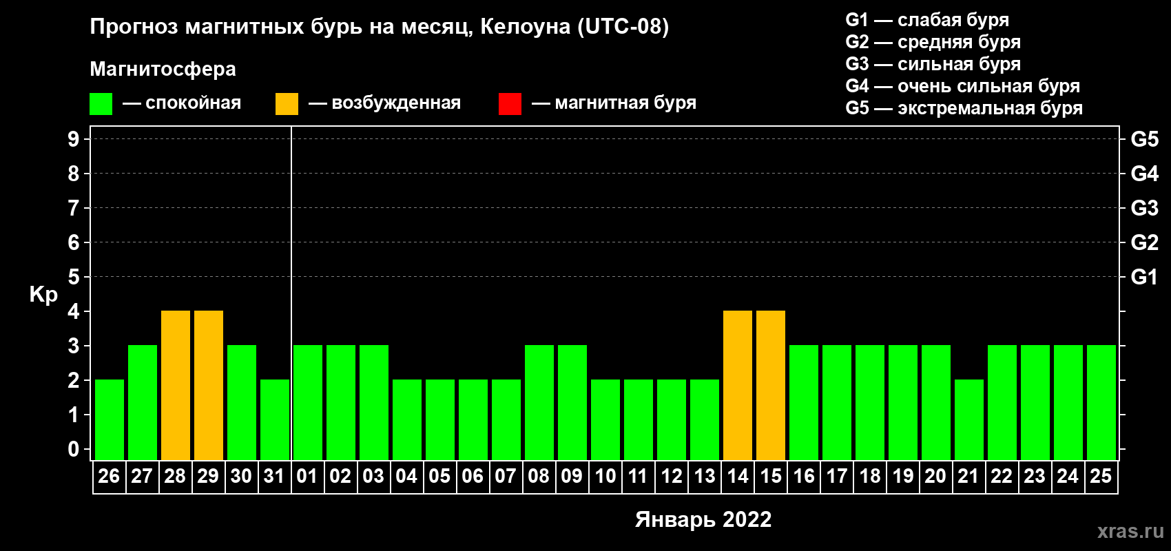 Прогноз магнитных бурь в Келоуне на 26 декабря 2021 года