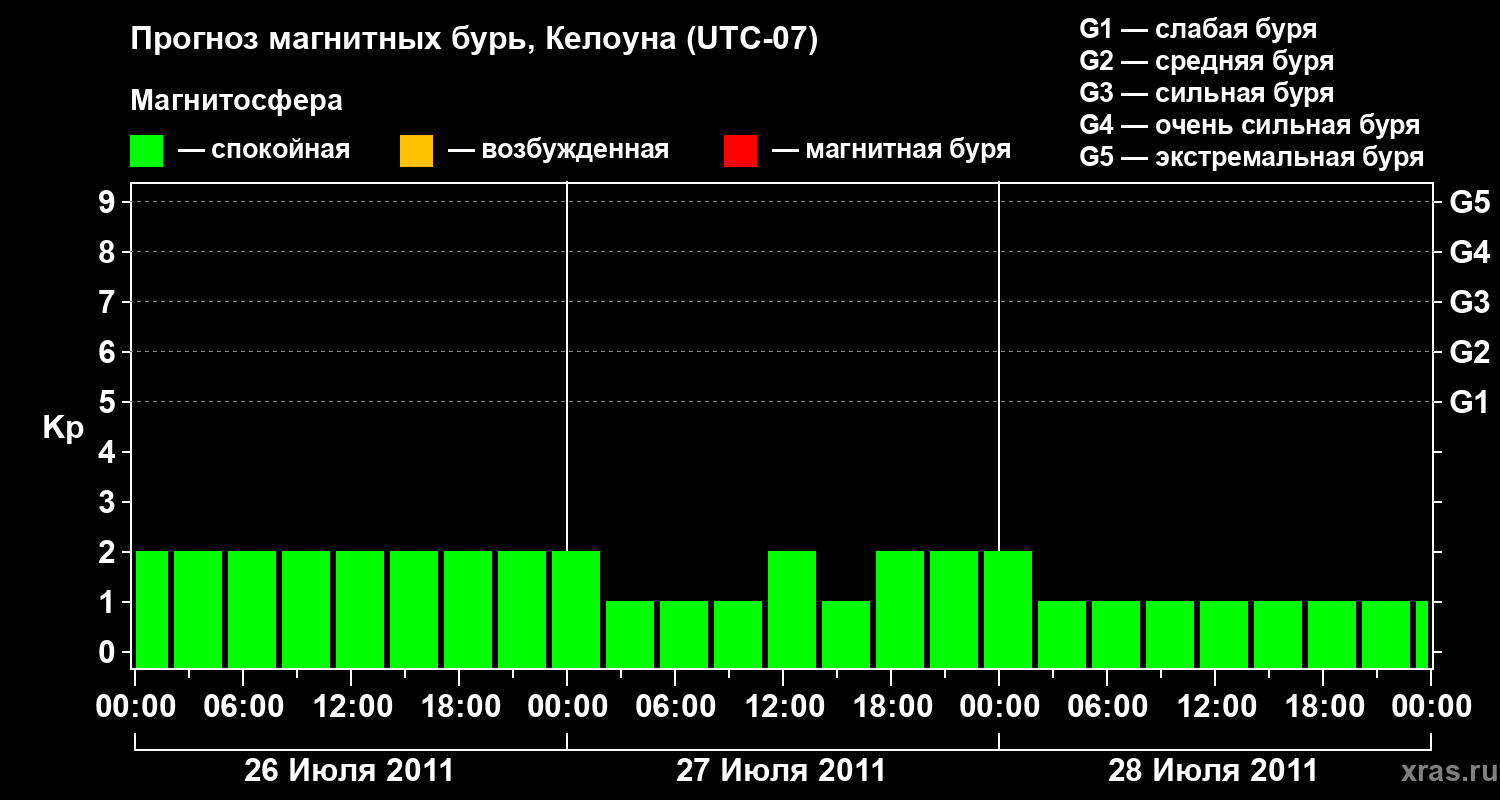 Прогноз магнитных бурь в Келоуне на 26 июля 2011 года