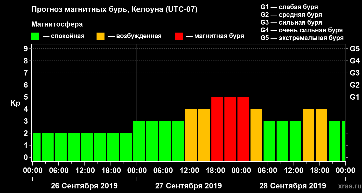 Прогноз магнитных бурь в Келоуне на 26 сентября 2019 года