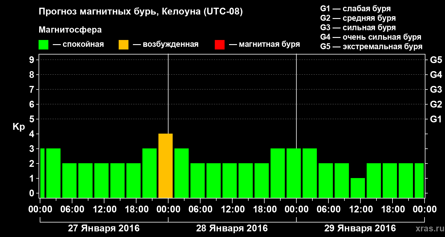 Прогноз магнитных бурь в Келоуне на 27 января 2016 года