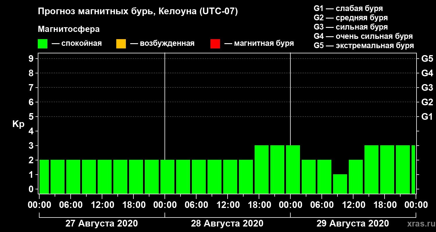 Прогноз магнитных бурь в Келоуне на 27 августа 2020 года