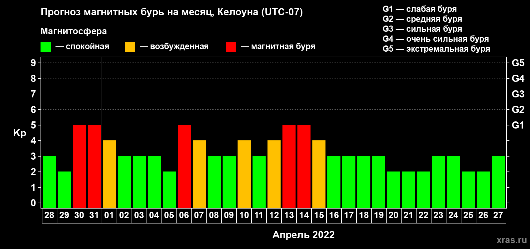 Прогноз магнитных бурь в Келоуне на 28 марта 2022 года