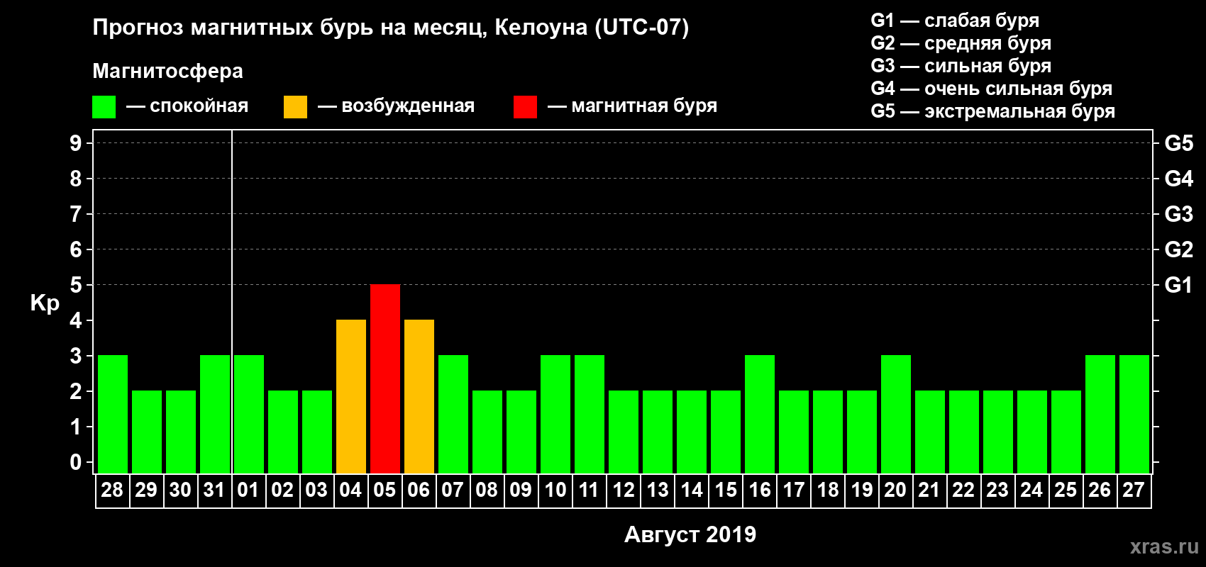 Прогноз магнитных бурь в Келоуне на 28 июля 2019 года