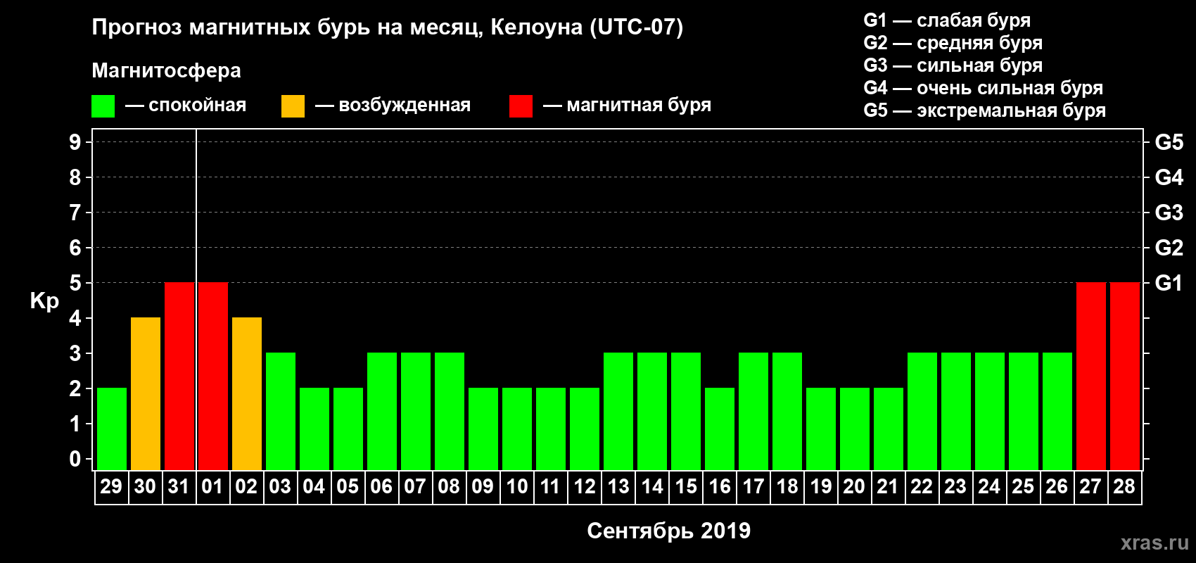Прогноз магнитных бурь в Келоуне на 29 августа 2019 года