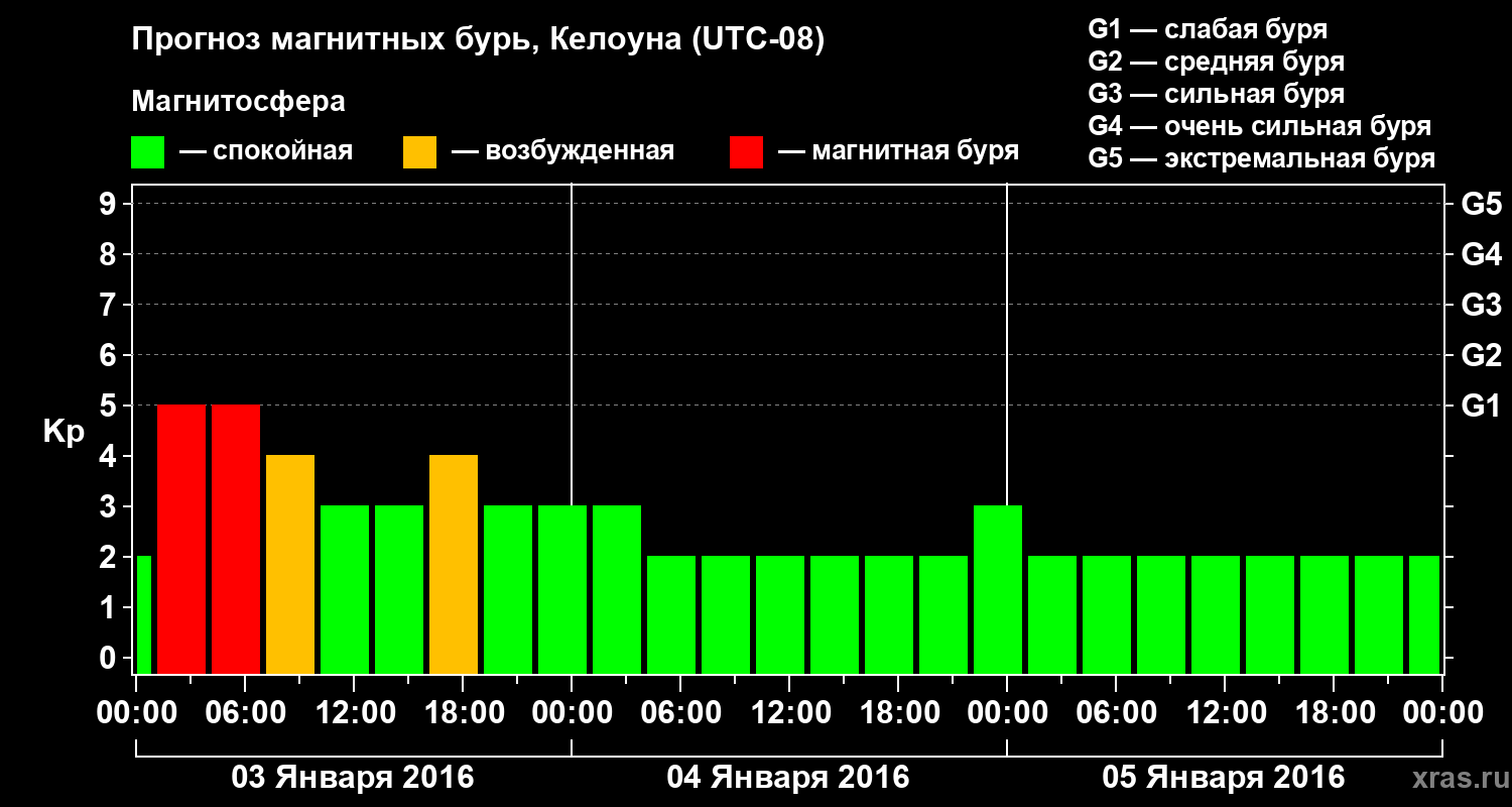 Прогноз магнитных бурь в Келоуне на 3 января 2016 года