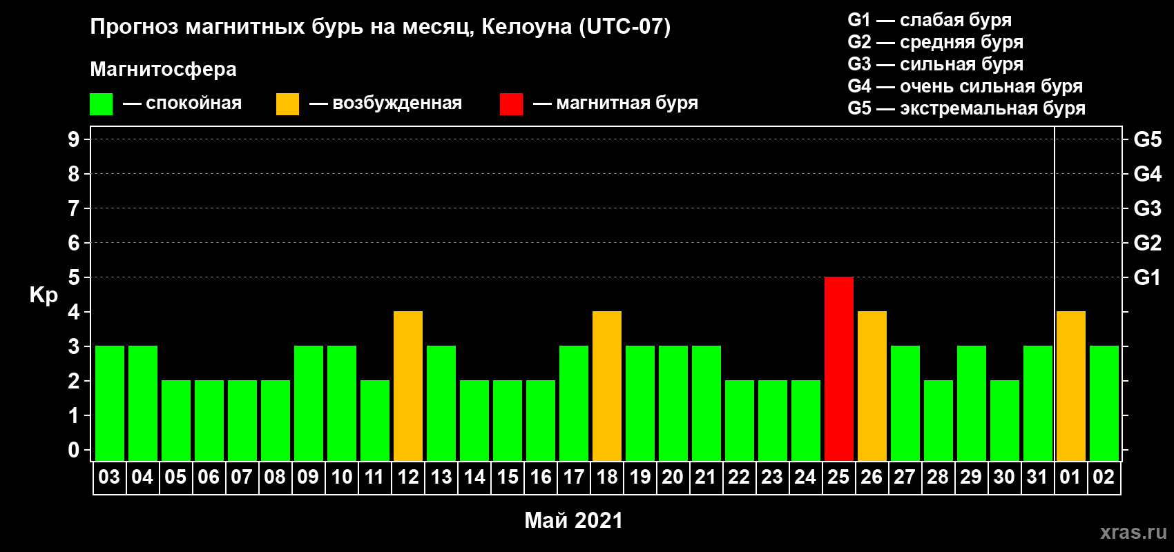 Прогноз магнитных бурь в Келоуне на 3 мая 2021 года