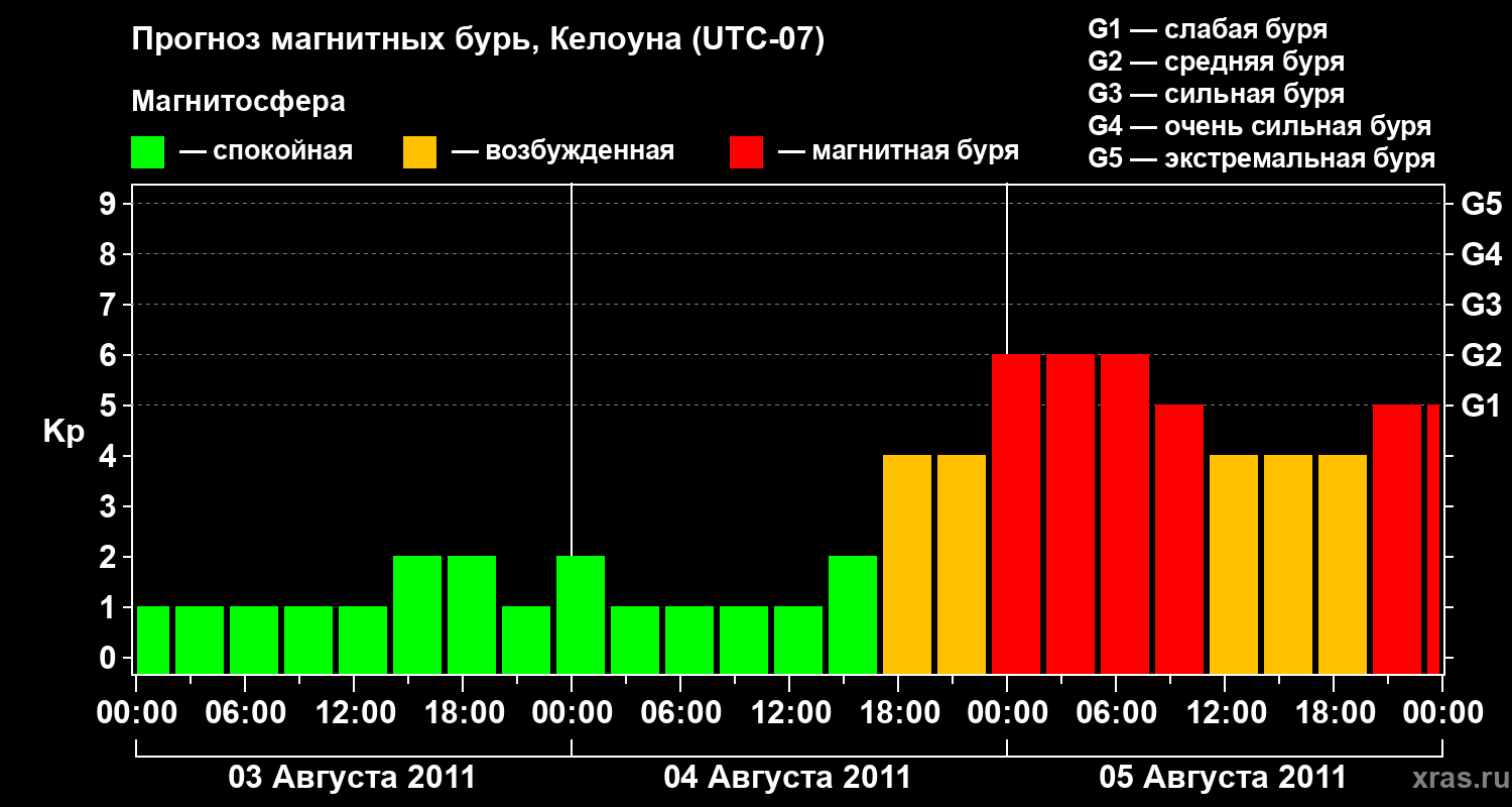 Прогноз магнитных бурь в Келоуне на 3 августа 2011 года