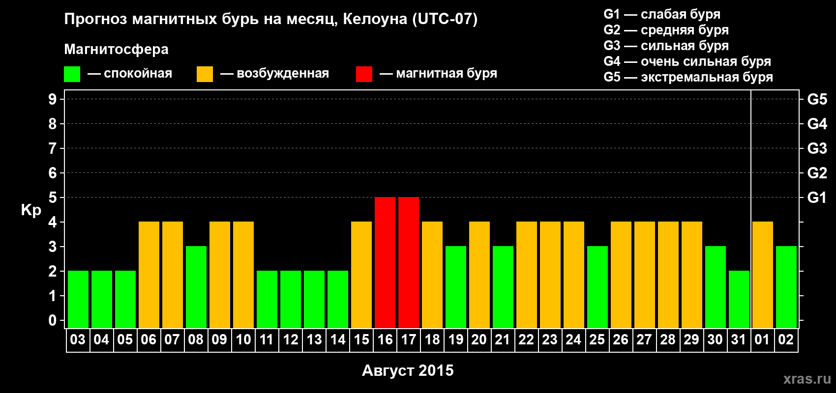 Прогноз магнитных бурь в Келоуне на 3 августа 2015 года
