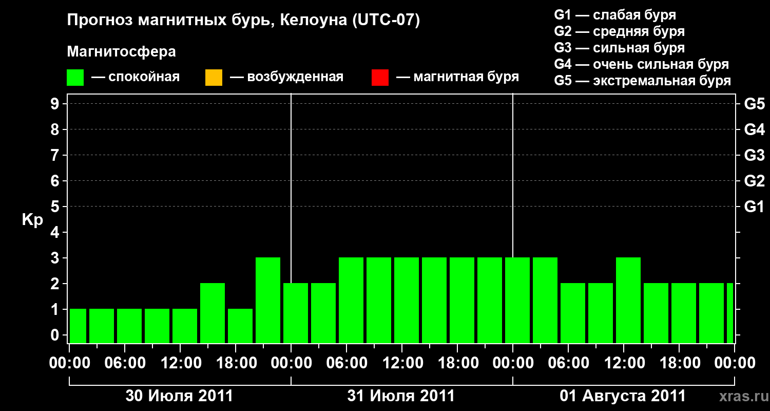Прогноз магнитных бурь в Келоуне на 30 июля 2011 года