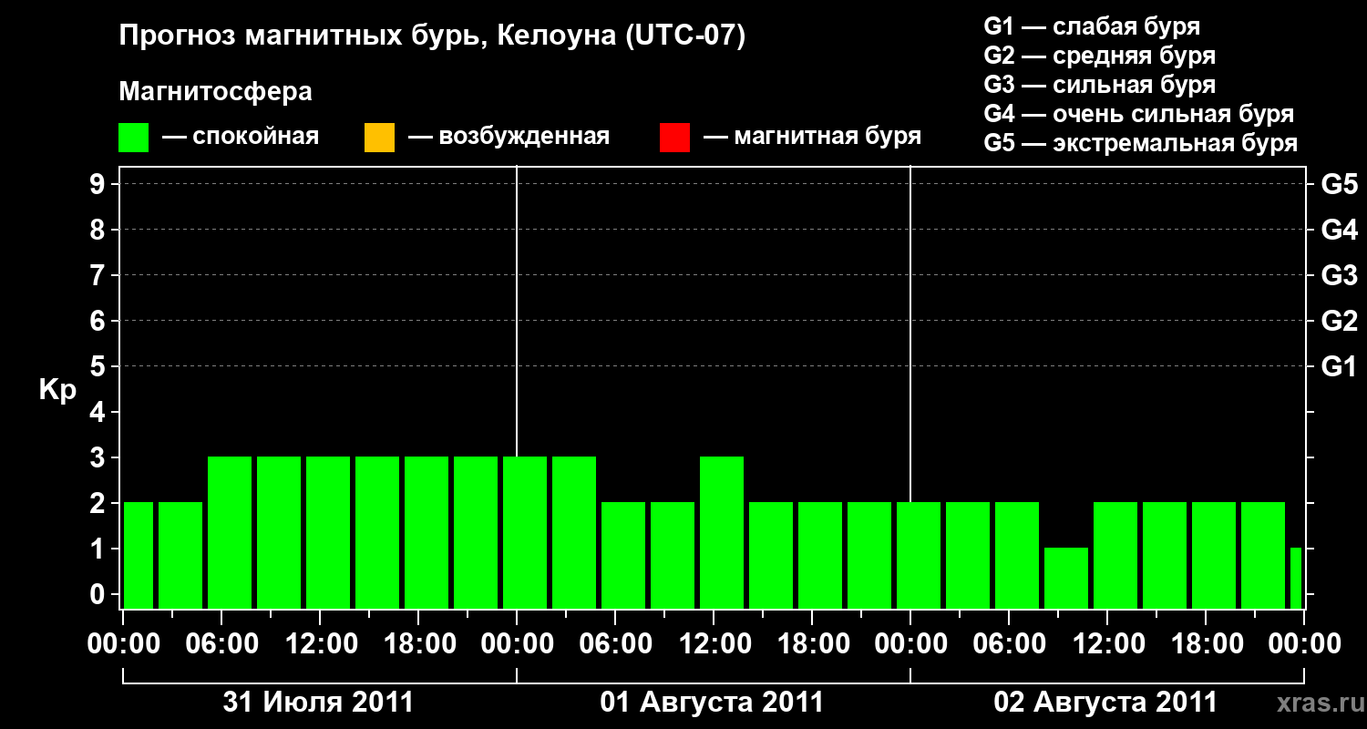 Прогноз магнитных бурь в Келоуне на 31 июля 2011 года