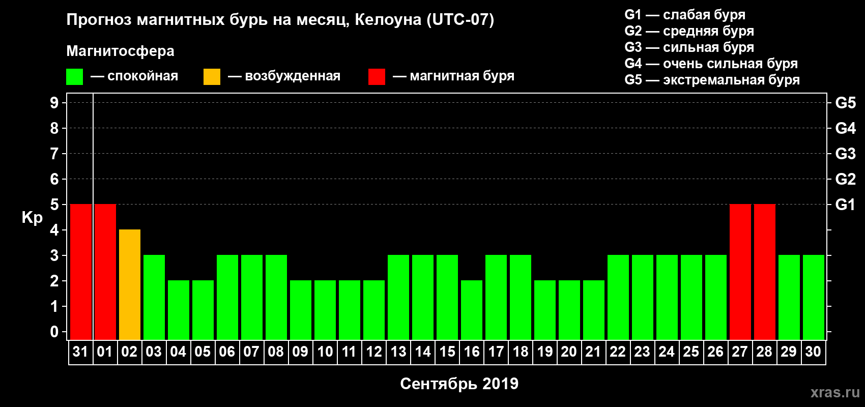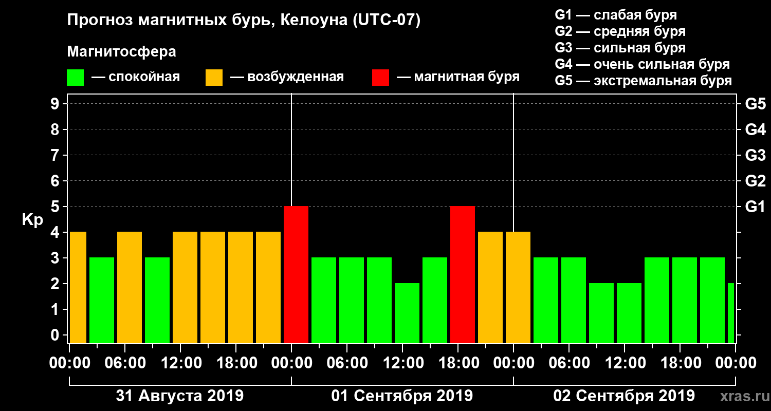Прогноз магнитных бурь в Келоуне на 31 августа 2019 года