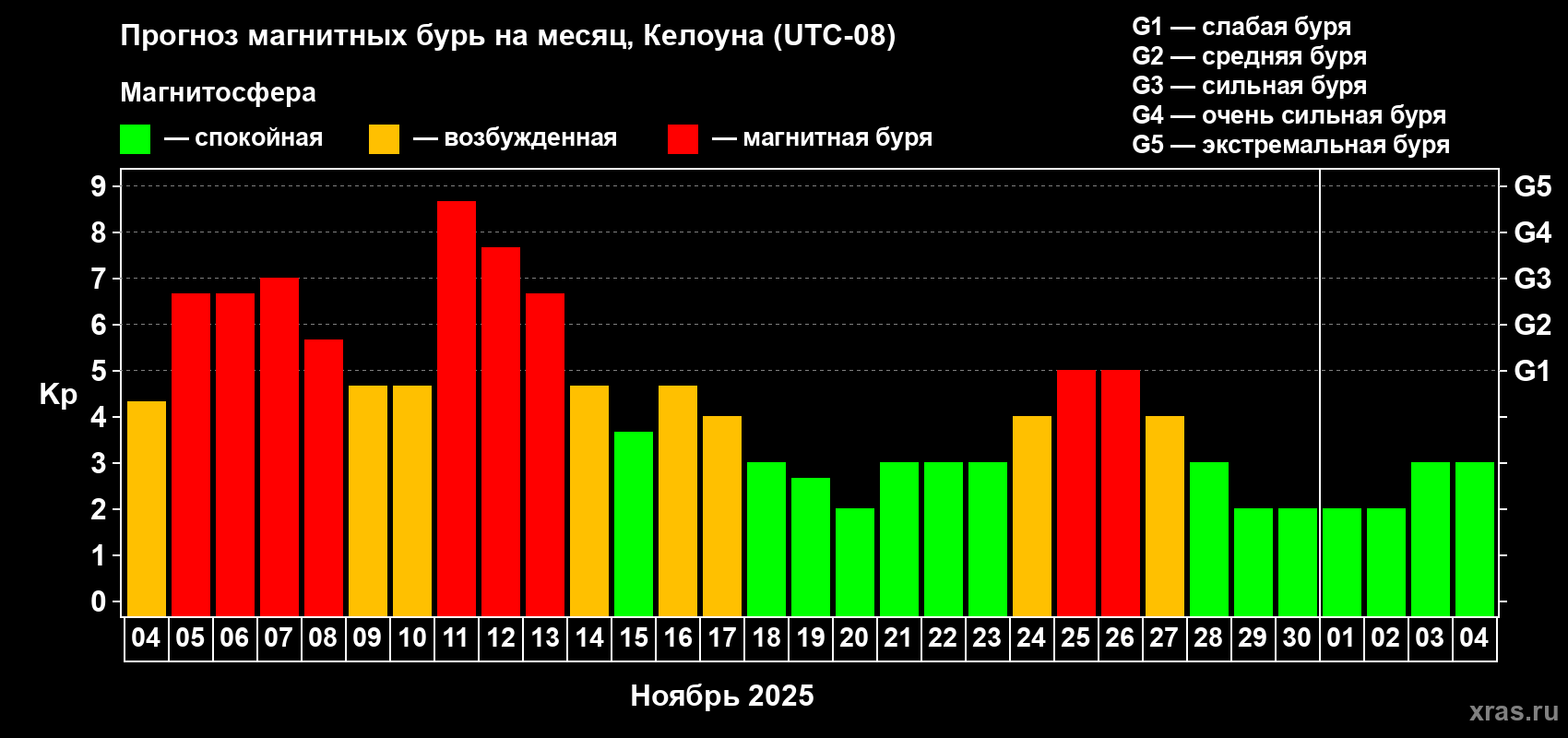 Прогноз магнитных бурь в Келоуне на 4 ноября 2025 года