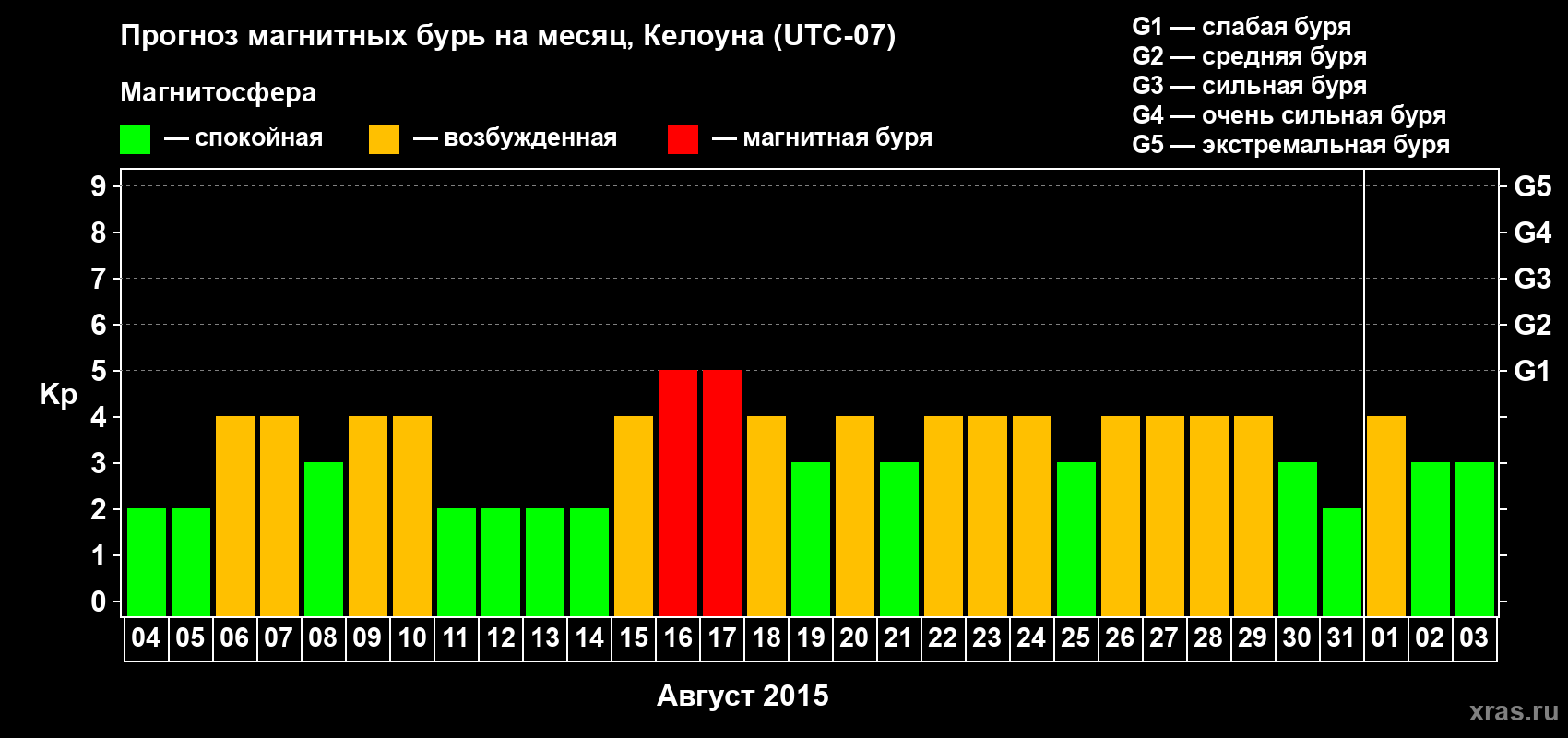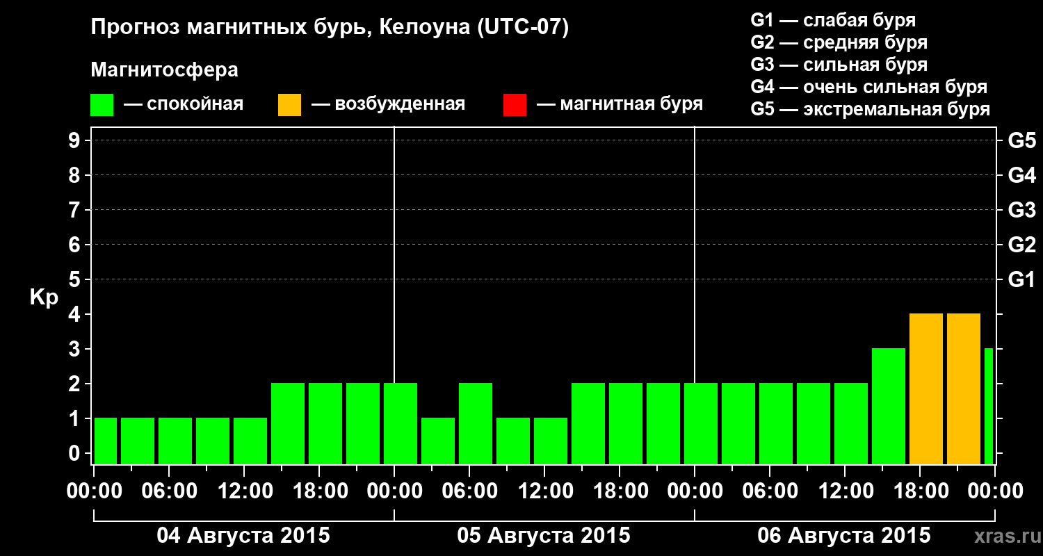 Прогноз магнитных бурь в Келоуне на 4 августа 2015 года