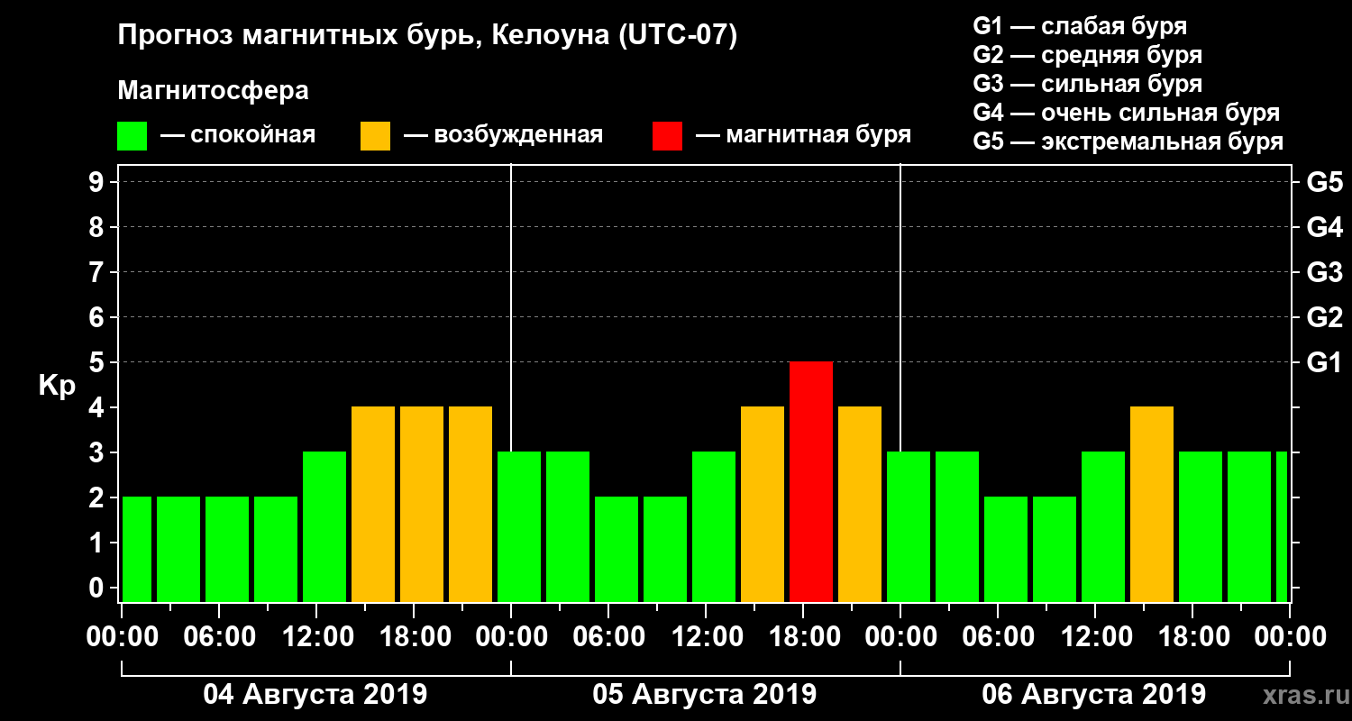 Прогноз магнитных бурь в Келоуне на 4 августа 2019 года