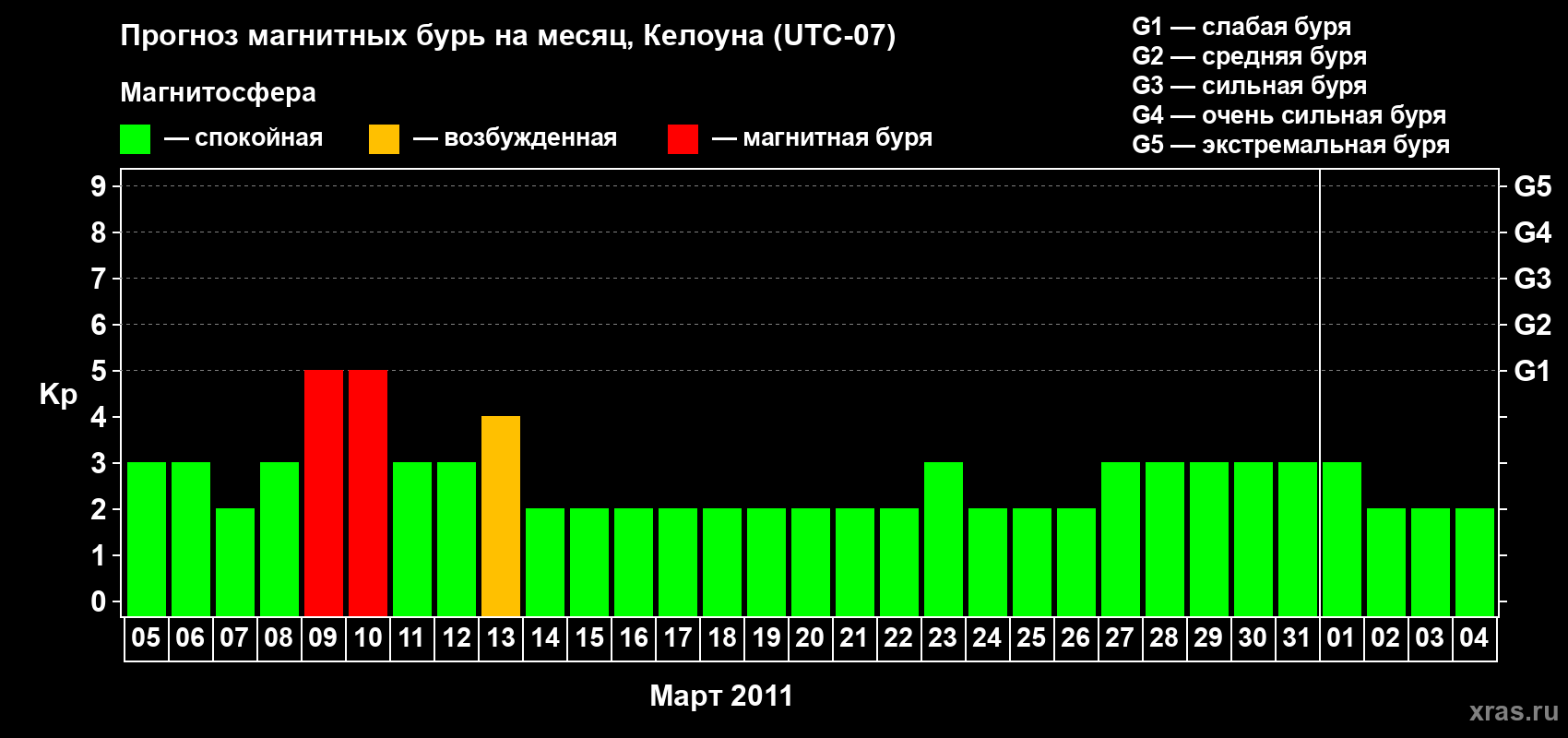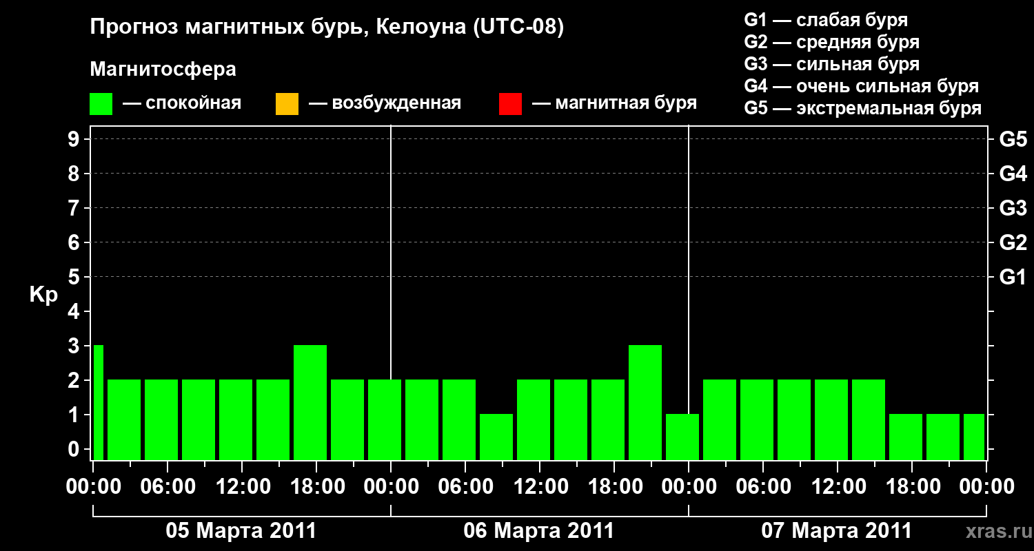 Прогноз магнитных бурь в Келоуне на 5 марта 2011 года