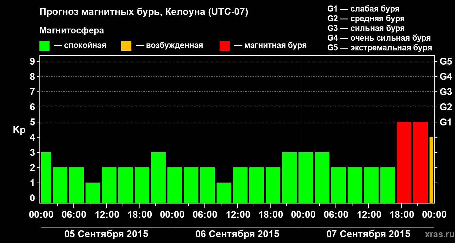 Прогноз магнитных бурь в Келоуне на 5 сентября 2015 года