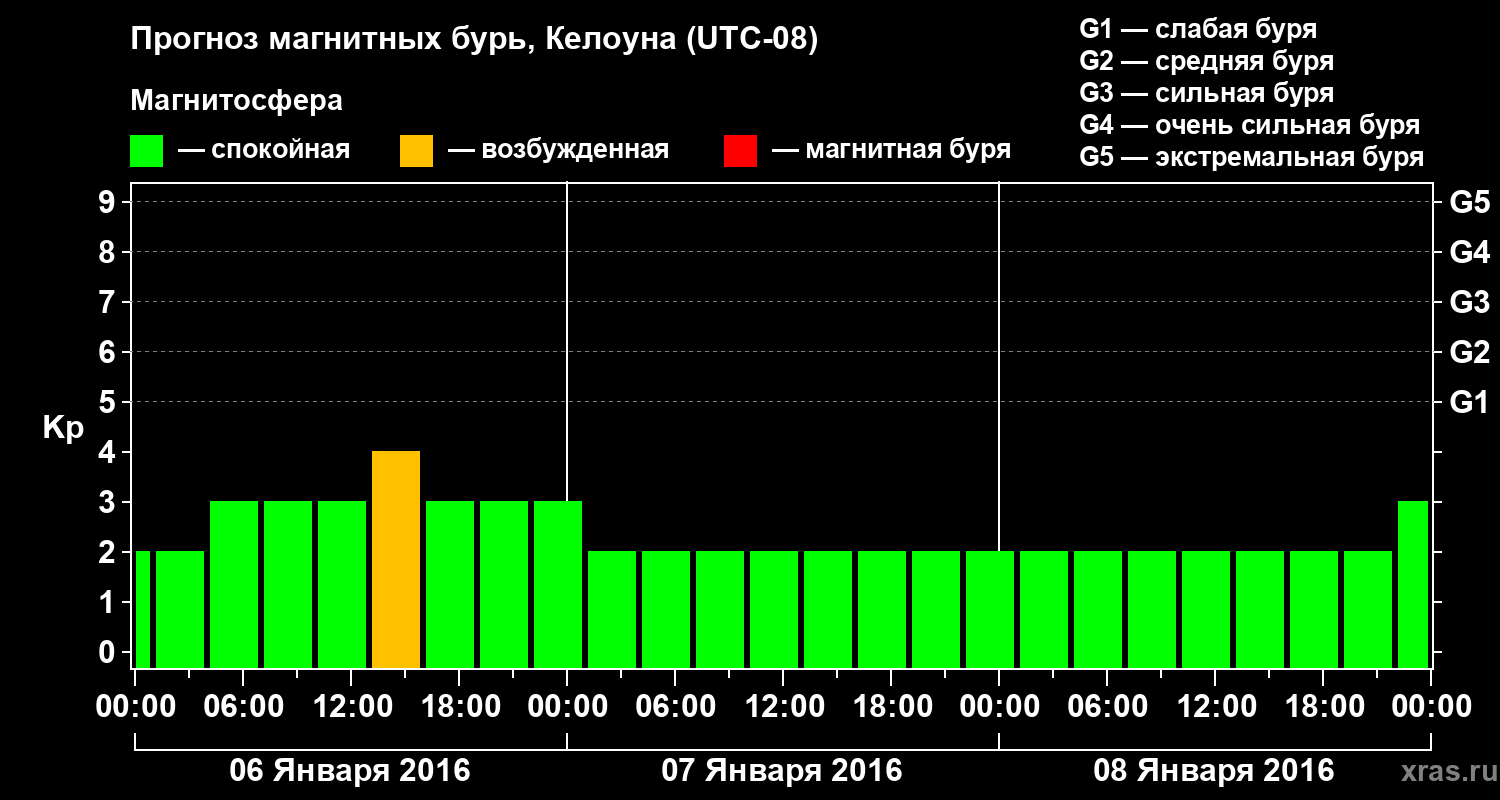Прогноз магнитных бурь в Келоуне на 6 января 2016 года