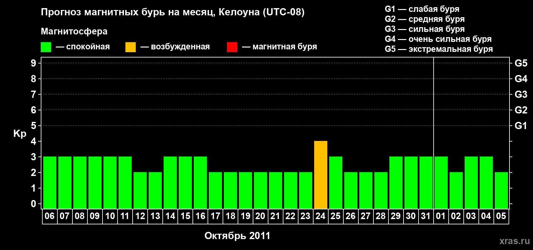 Прогноз магнитных бурь в Келоуне на 6 октября 2011 года
