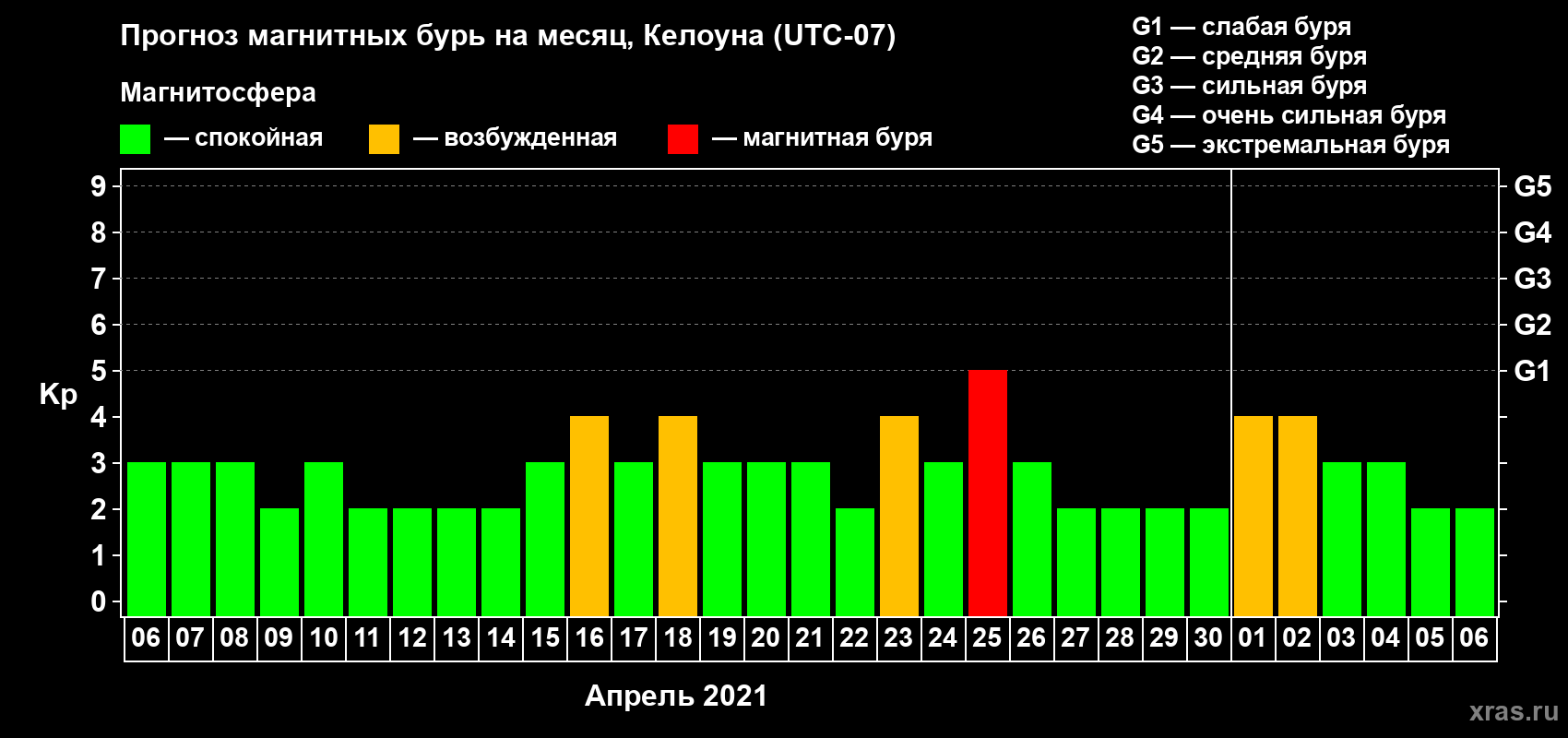 Прогноз магнитных бурь в Келоуне на 6 апреля 2021 года