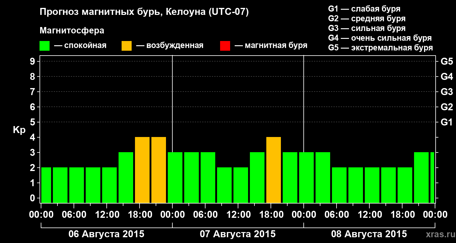 Прогноз магнитных бурь в Келоуне на 6 августа 2015 года