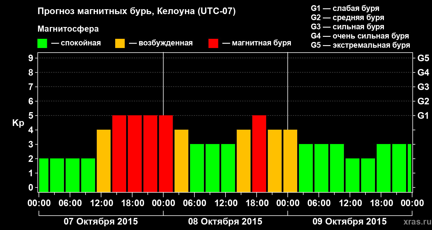 Прогноз магнитных бурь в Келоуне на 7 октября 2015 года