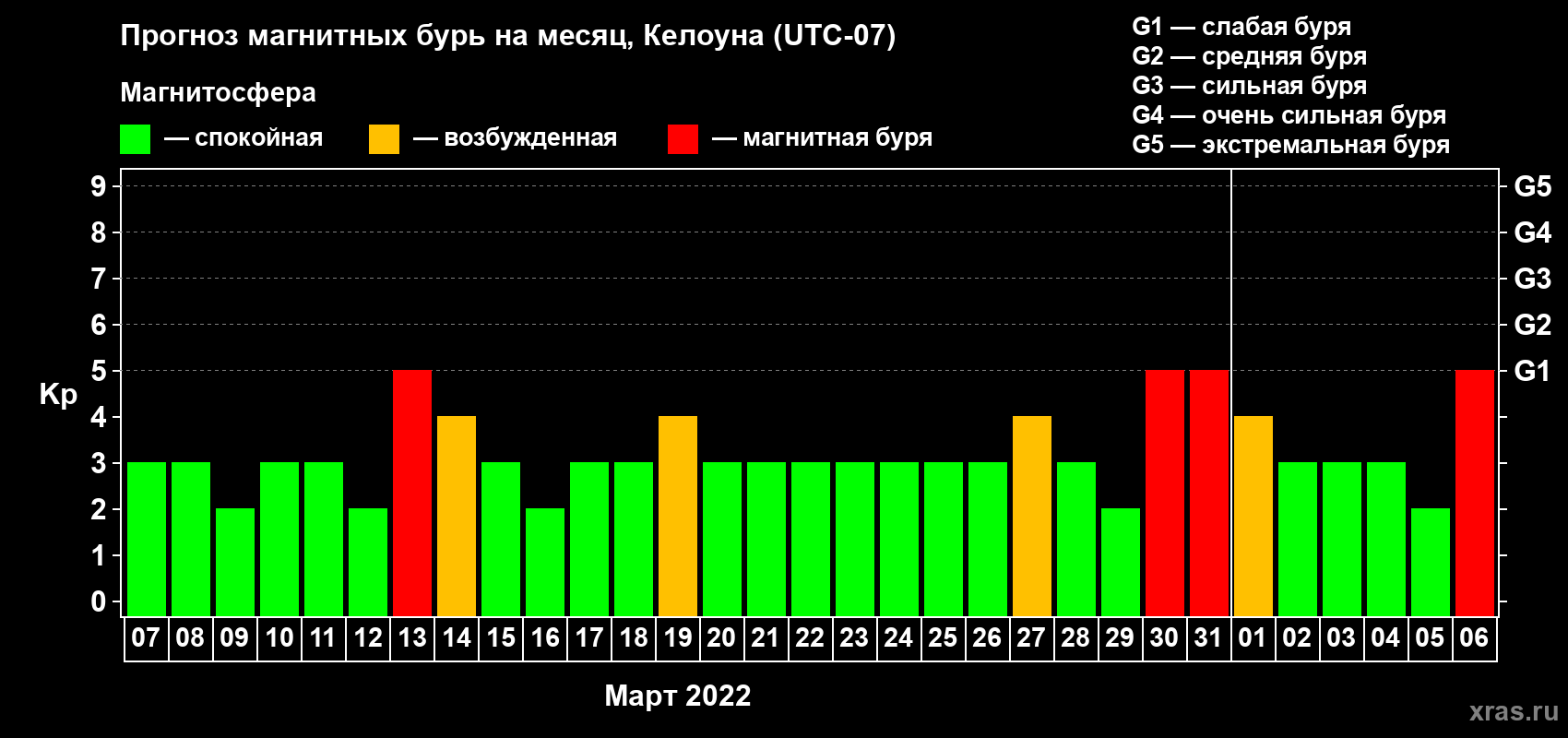 Прогноз магнитных бурь в Келоуне на 7 марта 2022 года
