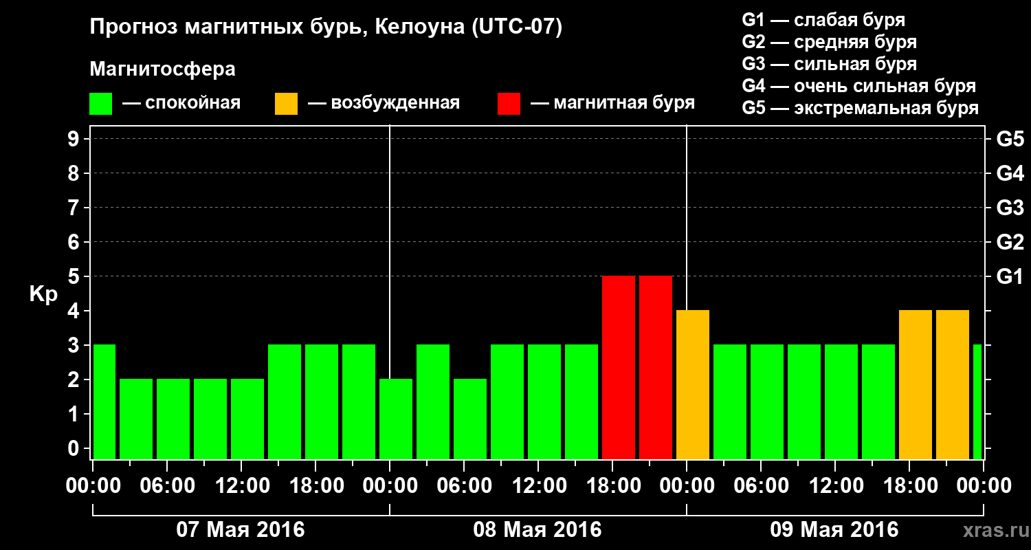 Прогноз магнитных бурь в Келоуне на 7 мая 2016 года