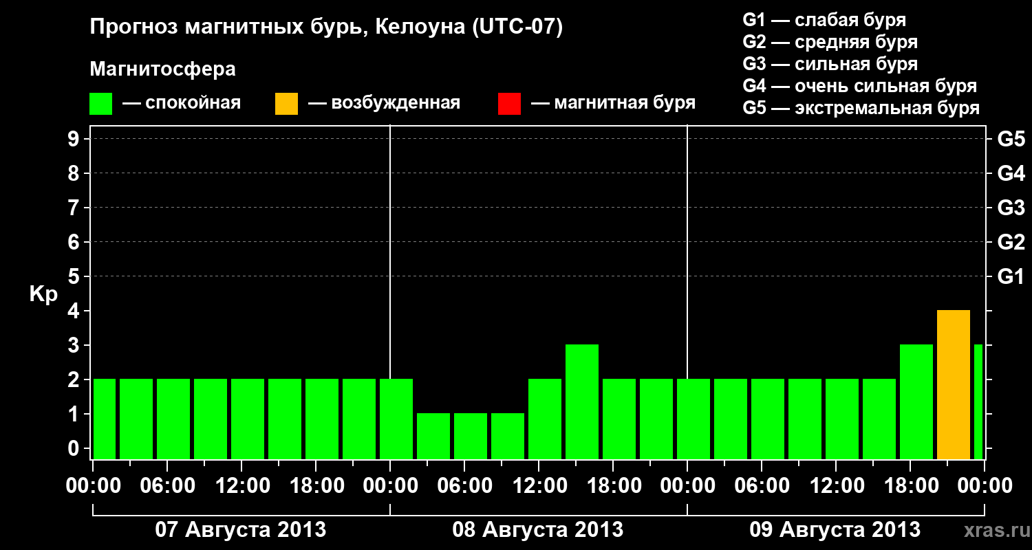 Прогноз магнитных бурь в Келоуне на 7 августа 2013 года