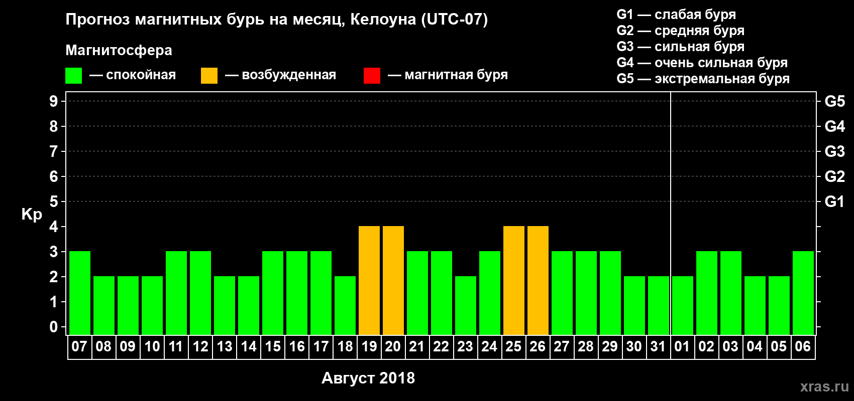 Прогноз магнитных бурь в Келоуне на 7 августа 2018 года